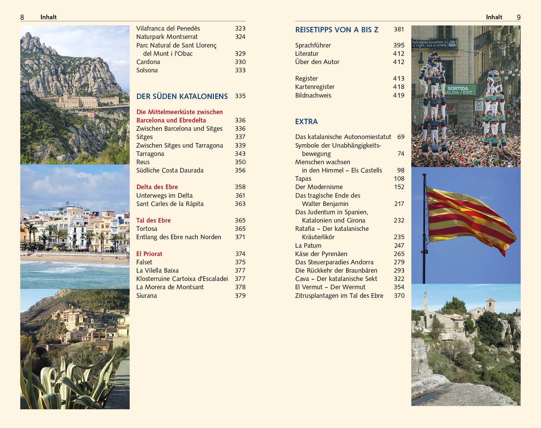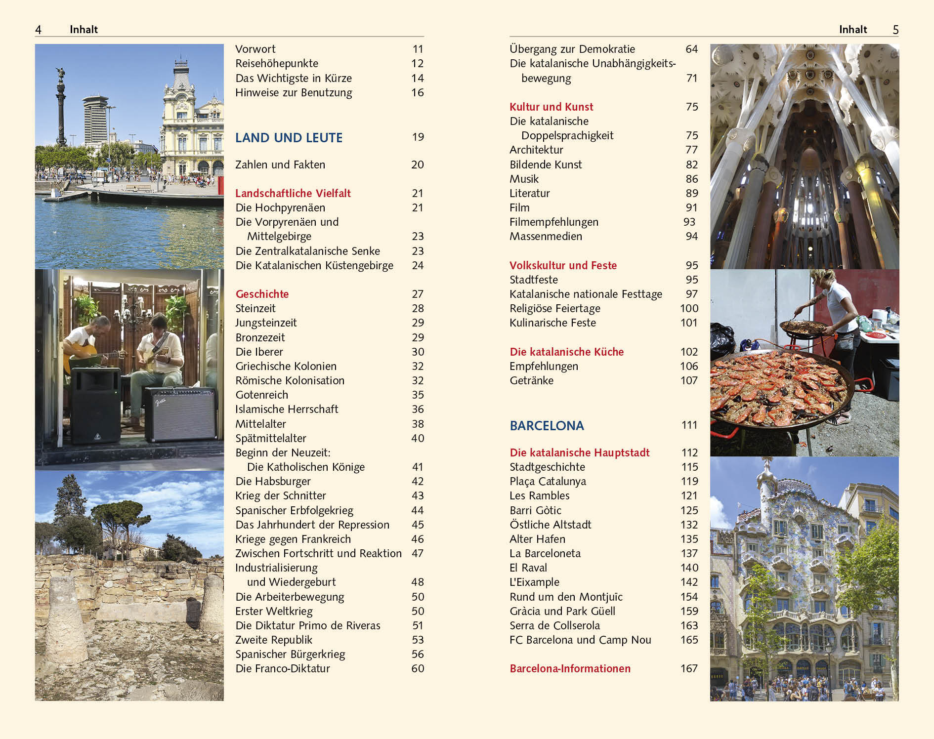 ROMANIK, GOTIK UND MODERNISME Architektur von Weltrang ' Seite 77 DIE UNBEUGSAMEN Das Streben nach Unabhängigkeit ' Seite 71 SARDANES, CASTELLS UND CORREFOC Kataloniens einzigartige Feste ' Seite 95 KULTURMETROPOLE AM MITTELMEER Barcelona ' Seite 111 MEHR ALS MASSENTOURISMUS Die Costa Brava ' Seite 179 CHARMANTE PROVINZ Die Vorpyrenäen ' Seite 219 BERGWELT MIT EINZIGARTIGEN KUNSTSCHÄTZEN Die Hochpyrenäen ' Seite 260 WEIN, OLIVEN UND TRADITION Die Zentrale Ebene ' Seite 307 VON TARRAGONA BIS ZUM EBRE-DELTA Der Süden ' Seite 335 Katalonien ist viel mehr als Bacelona und Costa Brava. Zwischen den Gipfeln der Pyrenäen und dem Delta des Ebre findet sich eine ungeheure landschaftliche Vielfalt auf kleinstem Raum, die zum Radfahren, Tauchen, Surfen, Rafting, Fallschirmspringen, Ballonfahren oder Canyoning einlädt. Bauwerke verschiedenster Epochen gehören zum Weltkulturerbe der UNESCO. Ursprüngliche mittelalterliche Dörfer und lebendige Kleinstädte finden sich in allen Regionen und bieten reizvolle Fotomotive. Man könnte Wochen damit verbringen, Museen, Galerien, Theater und Konzerthallen zu erkunden. Zu bestaunen ist das Werk weltberühmter einheimischer Künstler wie Antoni Gaudí, Pablo Picasso, Joan Miró und Salvador Dalí. Dabei gelingt den Katalanen der Spagat zwischen Tradition und Moderne. Mental stärker an Mitteleuropa als am Mittelmeer orientiert, hält das feier- und kommunikationsfreudige Volk uralte Bräuche am Leben und begeistert nicht nur die einheimische Jugend, sondern auch alle Besucher.