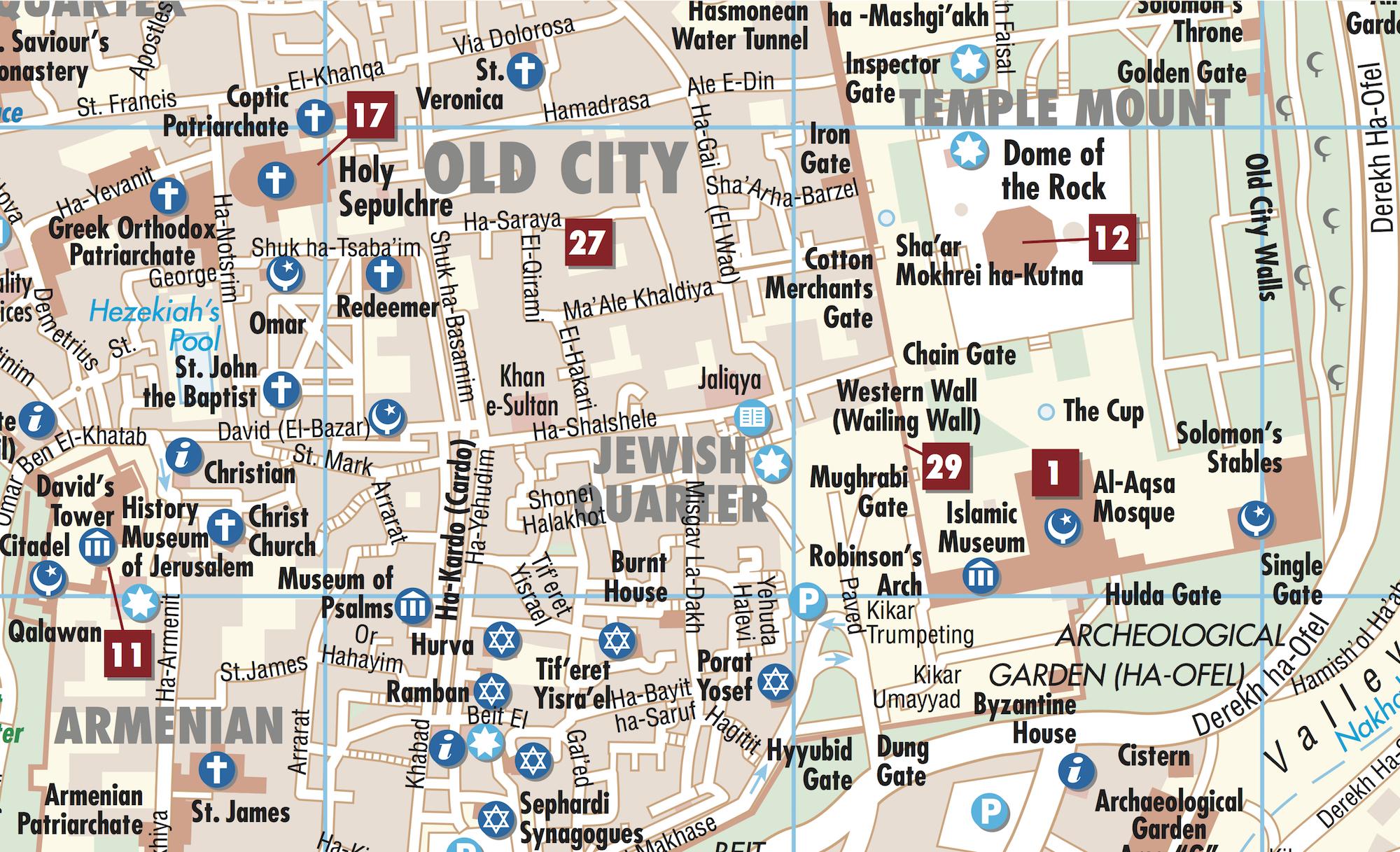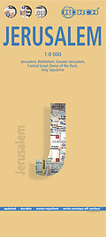Unsere folienbeschichtete, gefaltete Karte von Jerusalem in der 4. Auflage beinhaltet: Jerusalem 1:8 000, Bethlehem 1:11 000, den Großraum Jerusalem 1:30 000, den zentralen Teil Israels 1:400 000, den Felsendom, die Grabeskirche, eine administsrative Übersicht...