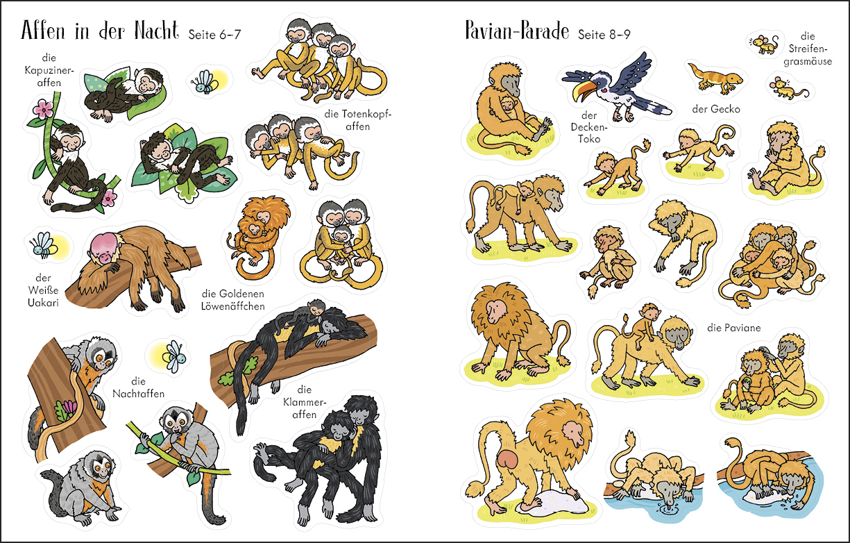 Die Affenbande ist los! In den Regenwäldern der Welt leben Orang-Utans, Schimpansen, Weiße Uakaris und viele mehr. Paviane durchstreifen die Savanne und Japanmakaken genießen ein Bad in einer heißen Quelle. Mit über 130 Stickern kannst du die neugierigen Affe...