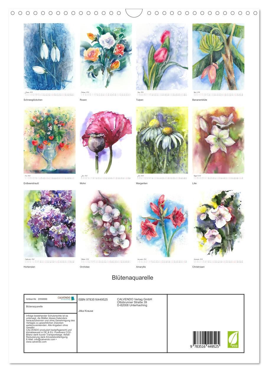 Heimische und exotische Blüten begleiten den Zuschauer durch das Jahr, meisterlich eingefangen in leichten, handgemalten Aquarellen, die die Liebe zu Blumen und zarten Blüten spüren lassen.