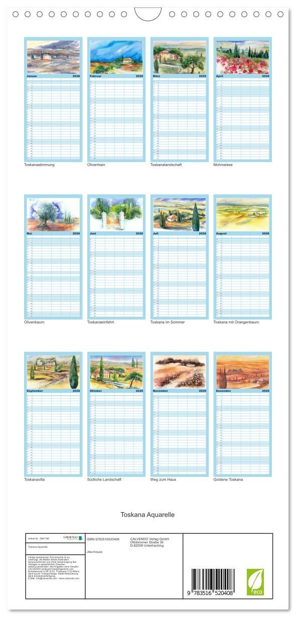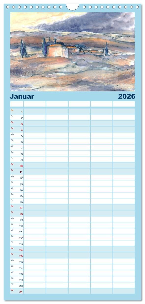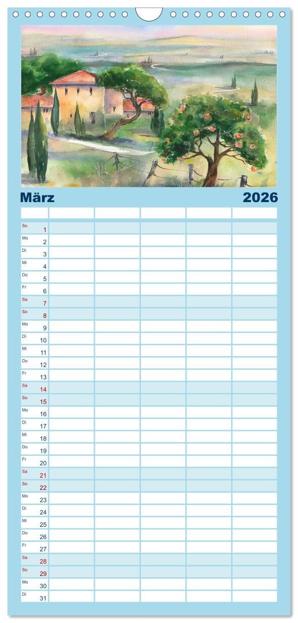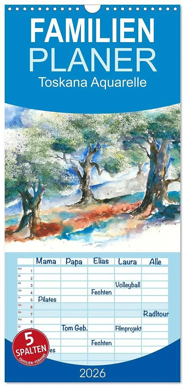 Familienplaner 2026 - Toskana Aquarelle mit 5 Spalten (Wandkalender, 21 x 45 cm) CALVENDO