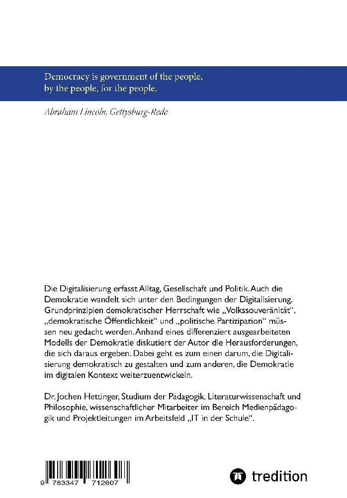 Die Digitalisierung erfasst Alltag, Gesellschaft und Politik. Auch die Demokratie wandelt sich unter den Bedingungen der Digitalisierung. Grundprinzipien demokratischer Herrschaft wie Volkssouveränität, demokratische Öffentlichkeit und politische Partizipation...