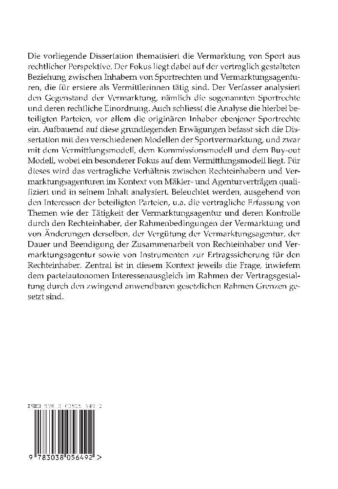 Die vorliegende Dissertation thematisiert die Vermarktung von Sport aus rechtlicher Perspektive. Der Fokus liegt dabei auf der vertraglich gestalteten Beziehung zwischen Inhabern von Sportrechten und Vermarktungsagenturen, die für erstere als Vermittlerinnen t...