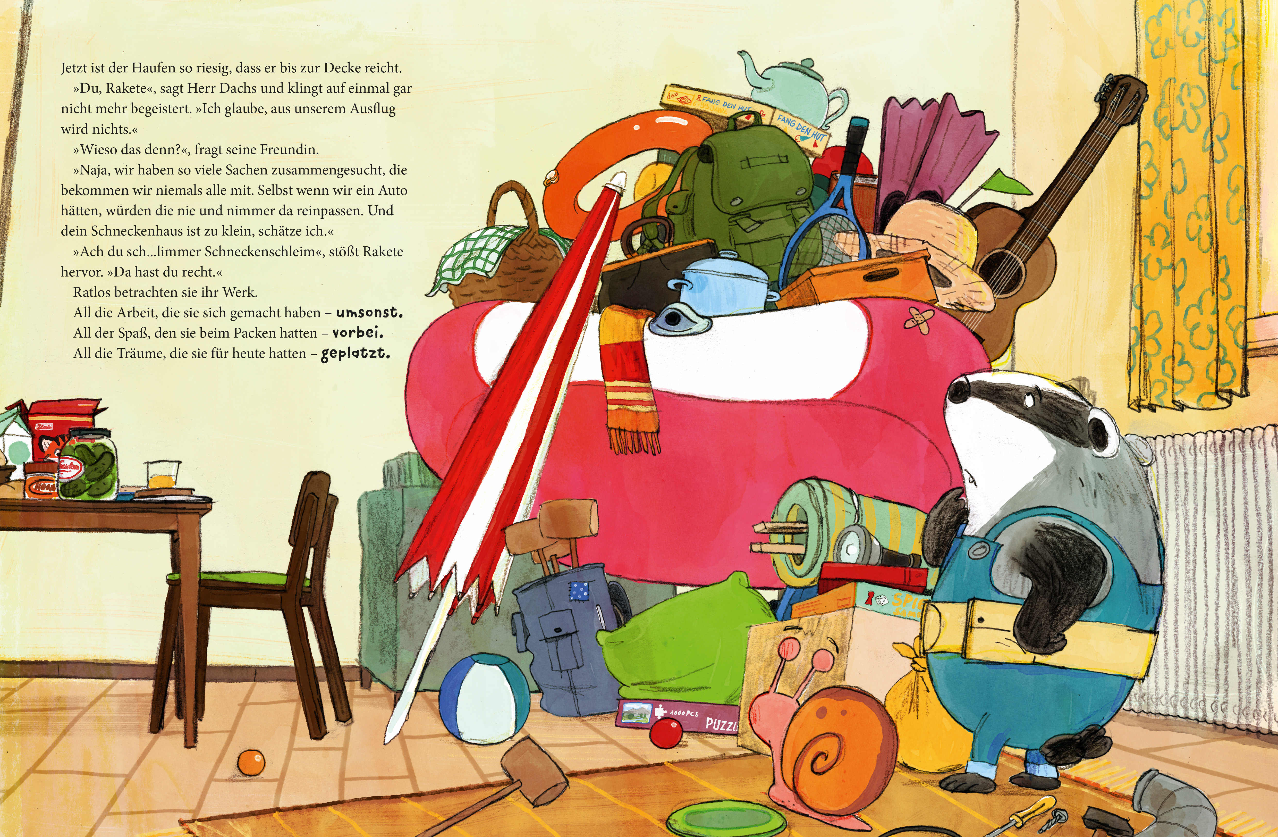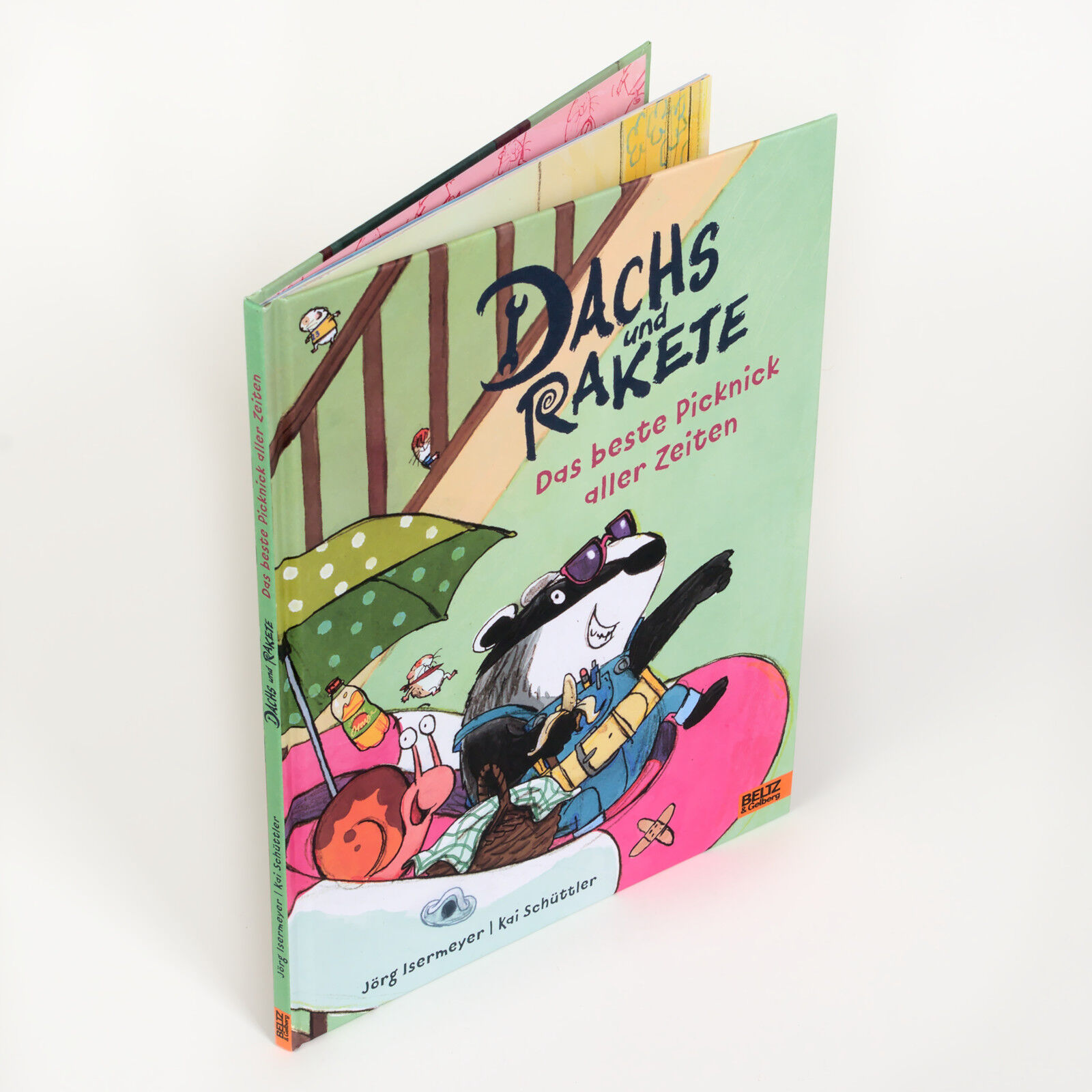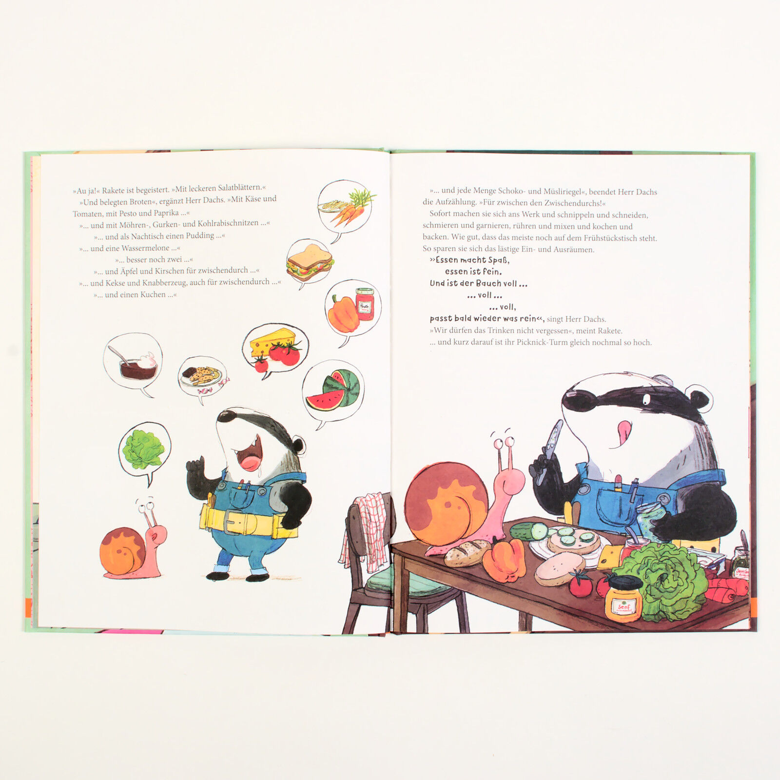 Das erste Bilderbuch von Herrn Dachs und Schnecke Rakete! Beide haben große Lust auf einen Ausflug mit Picknick. Also packen sie zusammen: Kohlrabischnitzen, Oliven, Wassermelone, Knabberzeug, Schokokuchen, Pudding, Decke, Thermosflasche, Bücher, Wikingerschac...