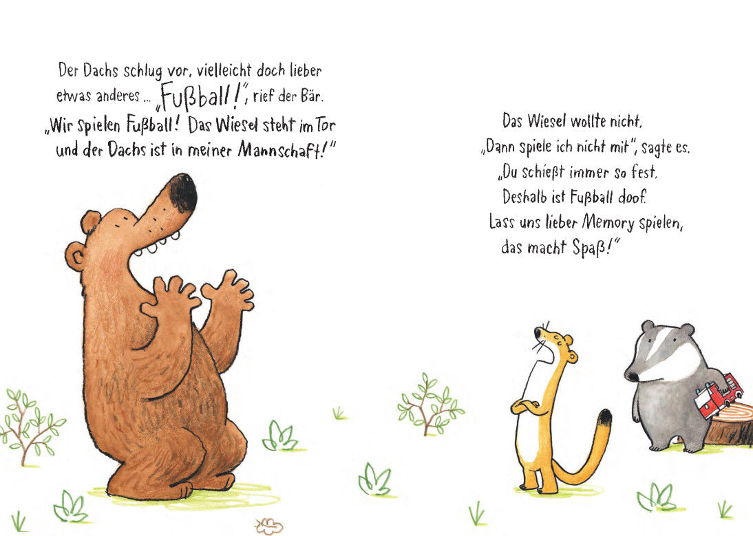 Als das Wiesel nach Hause kommt, traut es seinen Augen kaum: Bär und Dachs spielen miteinander. Das Wiesel ist sauer. Denn Dachs ist sein Freund! Spiel doch mit, schlägt der Dachs vor, doch Bär und Wiesel können sich nicht einigen, nicht auf Fußball, nicht auf...