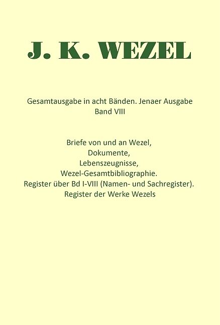 Dieser Band bildet den Abschluss der Gesamausgabe. Er enthält Briefe von und an Wezel; Dokumente und Lebenszeugnisse; eine Wezel-Gesamtbibliographie; das Register über die Bände 1 bis 8, ein Namen- und Sachregister sowie ein Register über die Werke Wezels.
