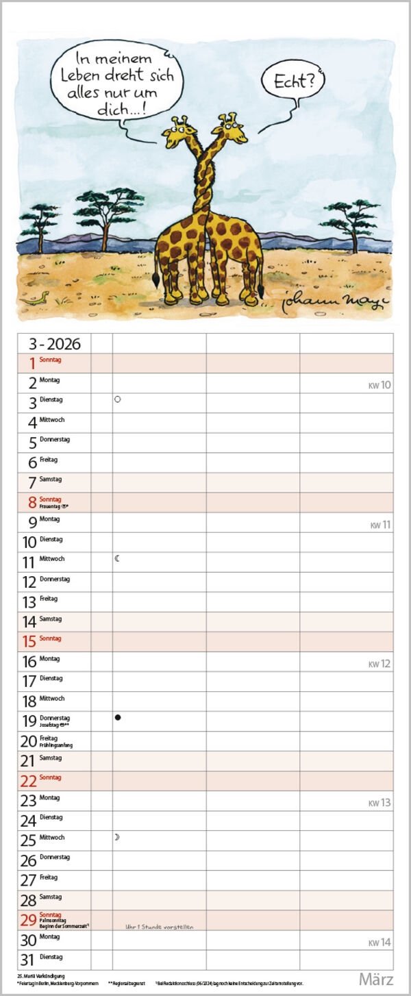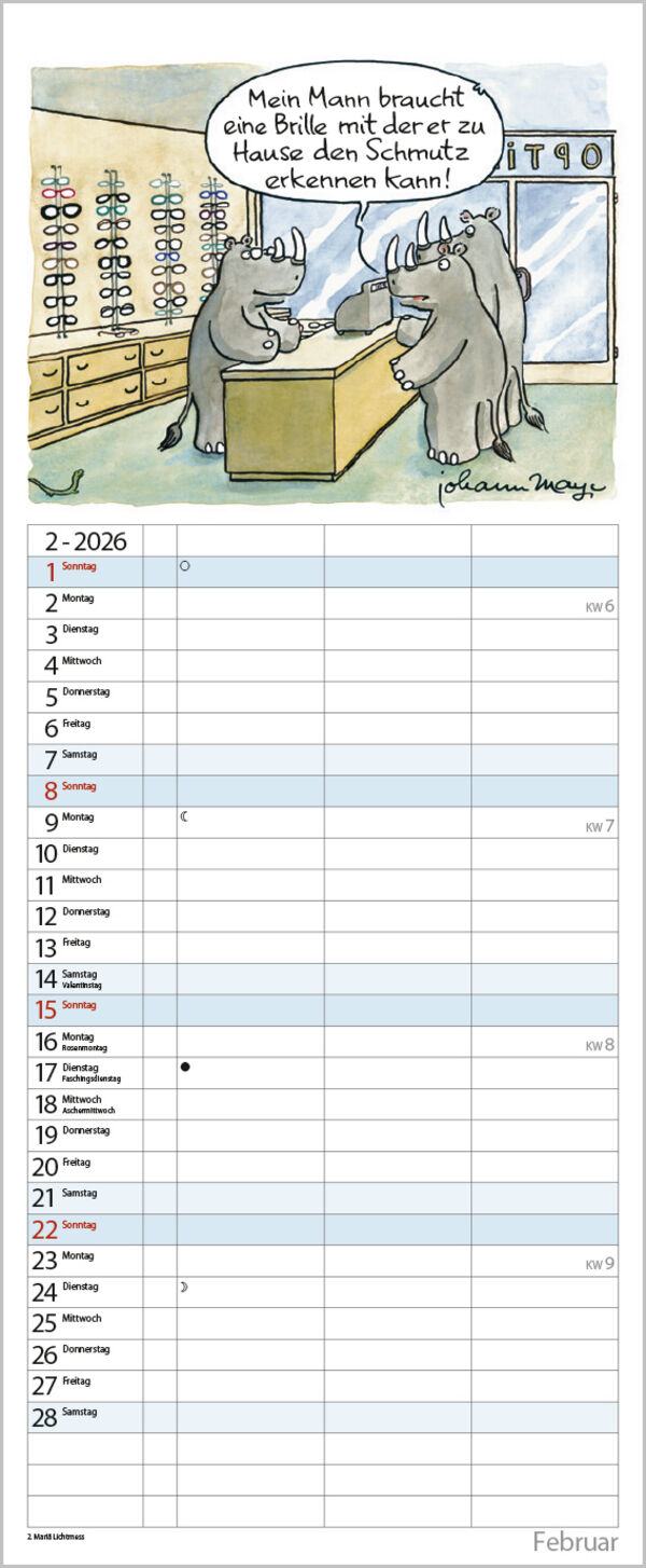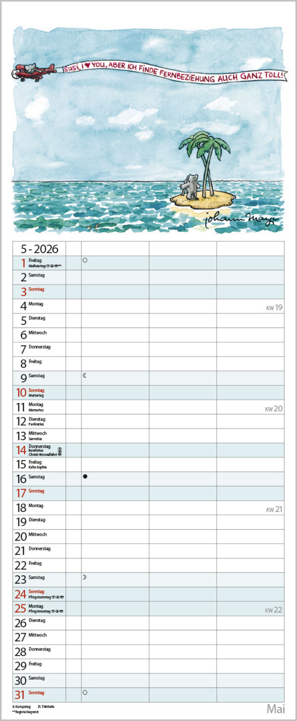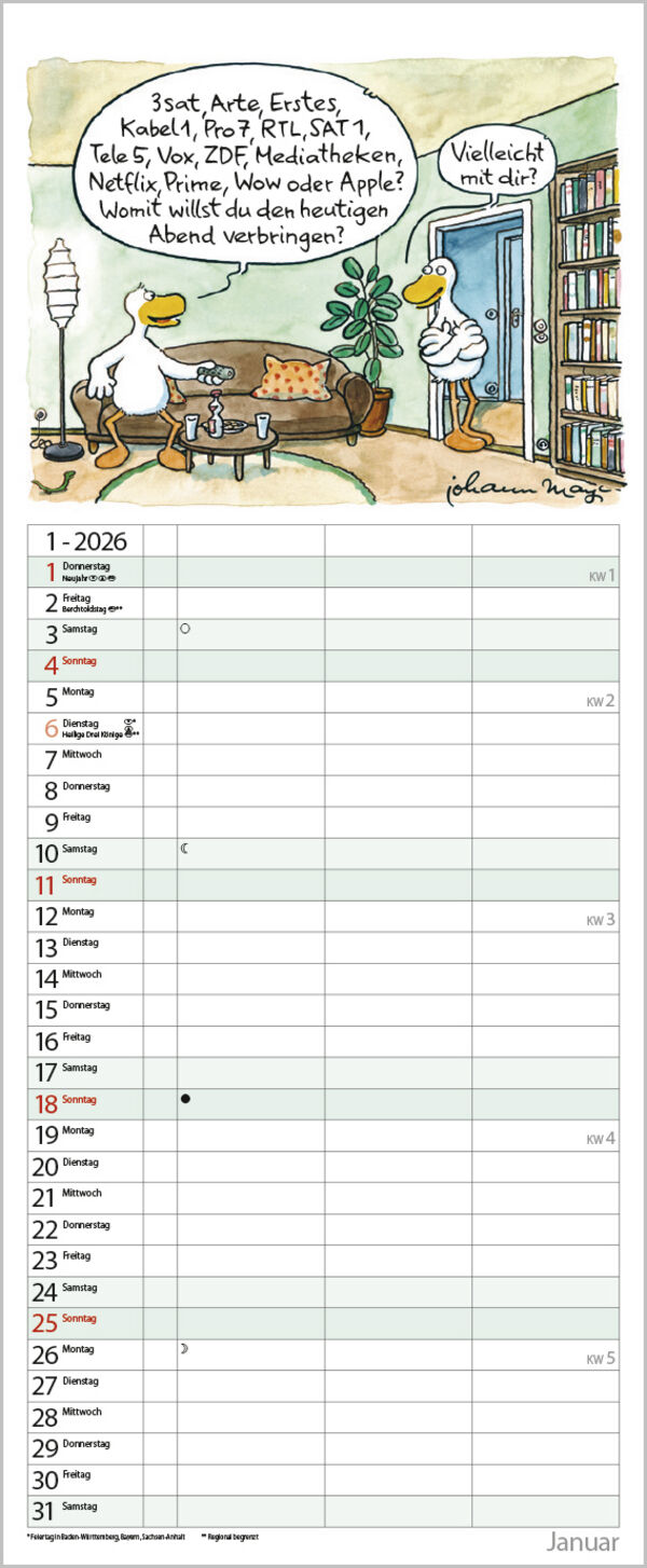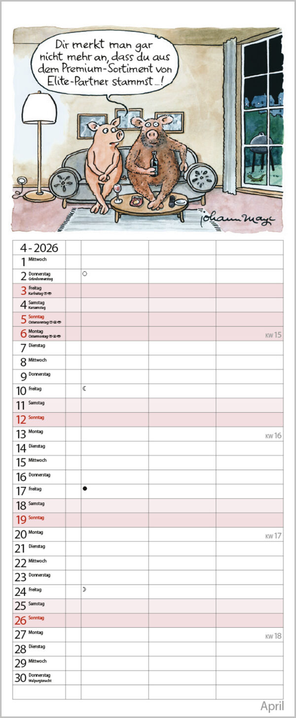 Korsch Familienkalender - Produktmerkmale Übersichtlicher Familienplaner für bis zu 3 Personen; sehr stabile Rückwand; 19 x 46 cm Jeden Monat ein lustiger Cartoon über den Spalten. Ohne störende Bilder in den Spalten Dickes, umweltfreundliches FSC Papier; lei...