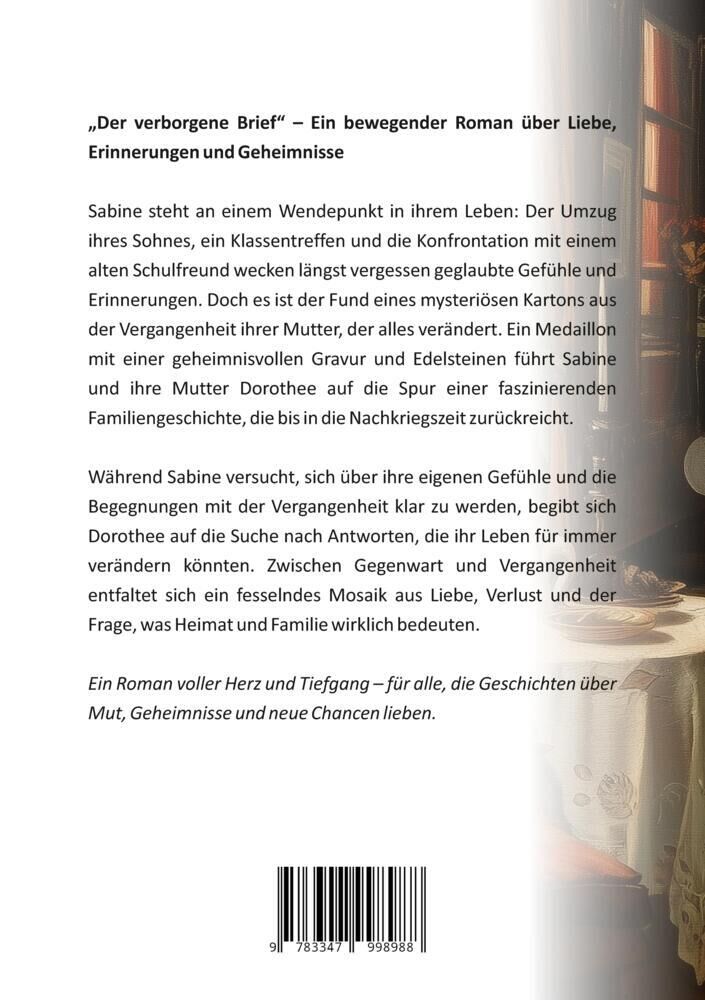 Der verborgene Brief Ein bewegender Roman über Liebe, Erinnerungen und Geheimnisse. Sabine steht an einem Wendepunkt in ihrem Leben: Der Umzug ihres Sohnes, ein Klassentreffen und die Konfrontation mit einem alten Schulfreund wecken längst vergessen geglaubte ...