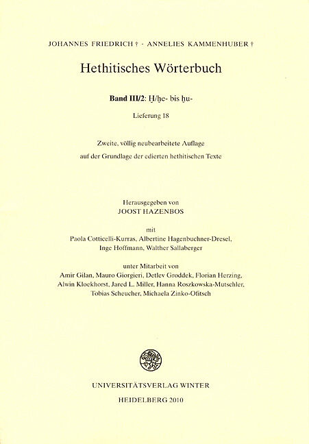 Als Großwörterbuch bietet das Hethitische Wörterbuch² (HW²) zu jedem Wort die wichtigsten Belegstellen mit ausführlichem Kontext in Transliteration und Übersetzung, die die Bedeutungsskala des Wortes (oder die Schwierigkeiten bei der Bedeutungsfestlegung) doku...