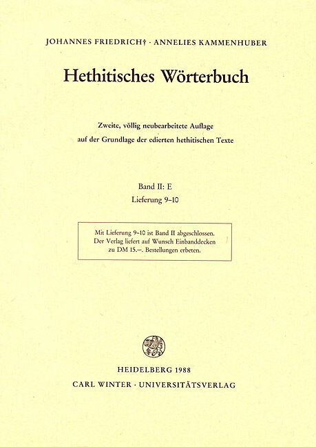 Als Großwörterbuch bietet das Hethitische Wörterbuch² (HW²) zu jedem Wort die wichtigsten Belegstellen mit ausführlichem Kontext in Transliteration und Übersetzung, die die Bedeutungsskala des Wortes (oder die Schwierigkeiten bei der Bedeutungsfestlegung) doku...