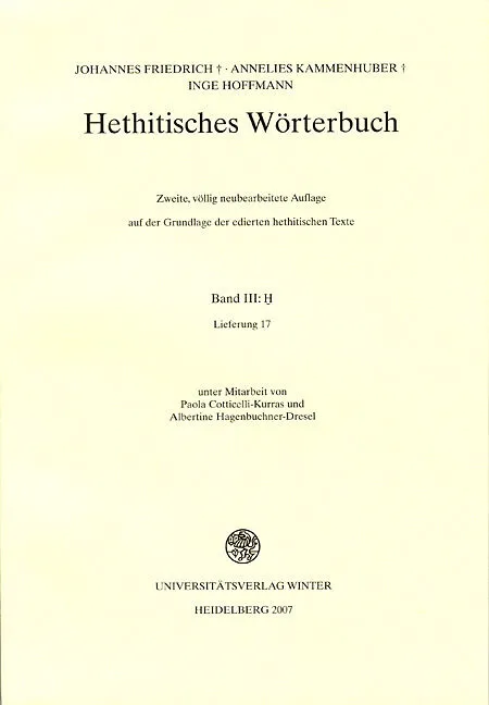 Als Großwörterbuch bietet das Hethitische Wörterbuch² (HW²) zu jedem Wort die wichtigsten Belegstellen mit ausführlichem Kontext in Transliteration und Übersetzung, die die Bedeutungsskala des Wortes (oder die Schwierigkeiten bei der Bedeutungsfestlegung) doku...