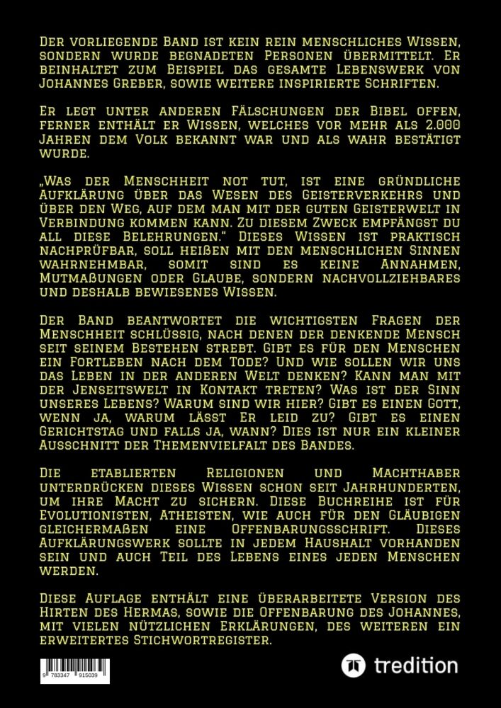 Der vorliegende Band ist kein rein menschliches Wissen, sondern wurde begnadeten Personen übermittelt. Er beinhaltet zum Beispiel das gesamte Lebenswerk von Johannes Greber sowie weitere inspirierte Schriften. Er legt unter anderen Fälschungen der Bibel offen,...