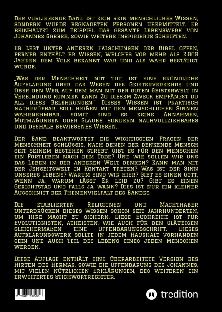 Der vorliegende Band ist kein rein menschliches Wissen, sondern wurde begnadeten Personen übermittelt. Er beinhaltet zum Beispiel das gesamte Lebenswerk von Johannes Greber sowie weitere inspirierte Schriften. Er legt unter anderen Fälschungen der Bibel offen,...