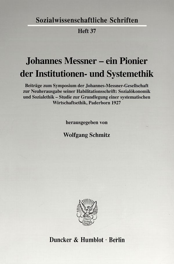 Inhalt: R. Weiler, Zur Eröffnung: Messners Weg von der Grundlegung seiner systematischen Wirtschaftsethik zur Grundlegung des Verhältnisses der Ethik zu den Sozialwissenschaften. Kritische Bemerkungen zum Begriff "Institutionen-" bzw. "Systemethik" - M. Schramm, Johannes Messner als Pionier einer modernen Systemethik - A. Habisch, Johannes Messners "Grundlegung einer systematischen Wirtschaftsethik". Ein Kursbuch christlicher Sozialethik auf dem Weg ins 21. Jahrhundert - W. Schmitz, Die Unentbehrlichkeit der Sozialökonomik für die Sozialethik. Gezeigt am heutigen Notstand einer Sozialverkündigung, die glaubt, darauf verzichten zu können - J. M. Schnarrer, Der übergreifende Konsens von Individuen über Institutionen und Systeme in Messners Habilitationsschrift und bei John Rawls
