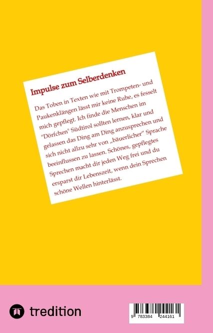 Das Toben in Texten mit Trompeten- und Paukenklängen lässt mir keine Ruhe, es fesselt mich gepflegt. Ich finde die Menschen im "Dörfchen" Südtirol sollten lernen, klar und gelassen das Ding am Ding anzusprechen und sich nicht allzu sehr von bäuerlicher Sprache...