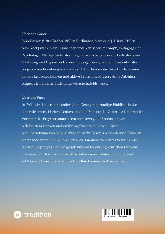 In "Wie wir denken" präsentiert John Dewey tiefgründige Einblicke in die Natur des menschlichen Denkens und die Bildung des Geistes. Als führender Vertreter des Pragmatismus beleuchtet Dewey die Bedeutung von reflektiertem Denken und erfahrungsbasiertem Lernen...