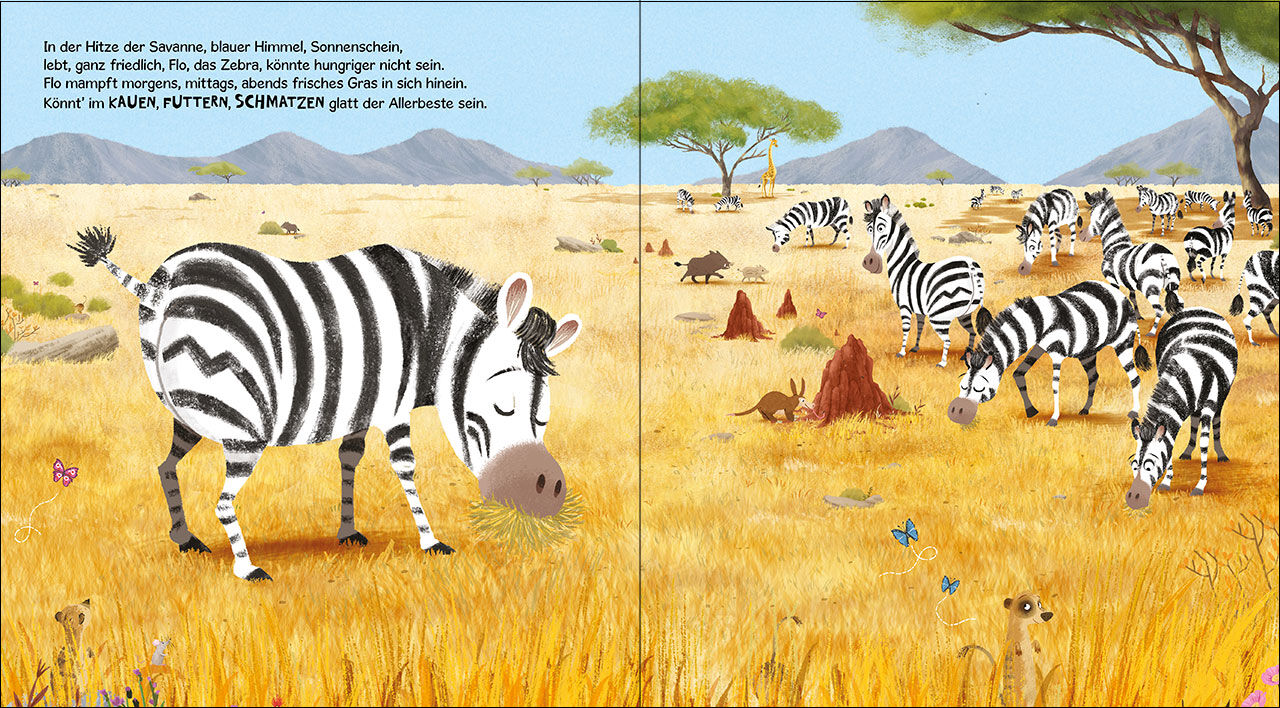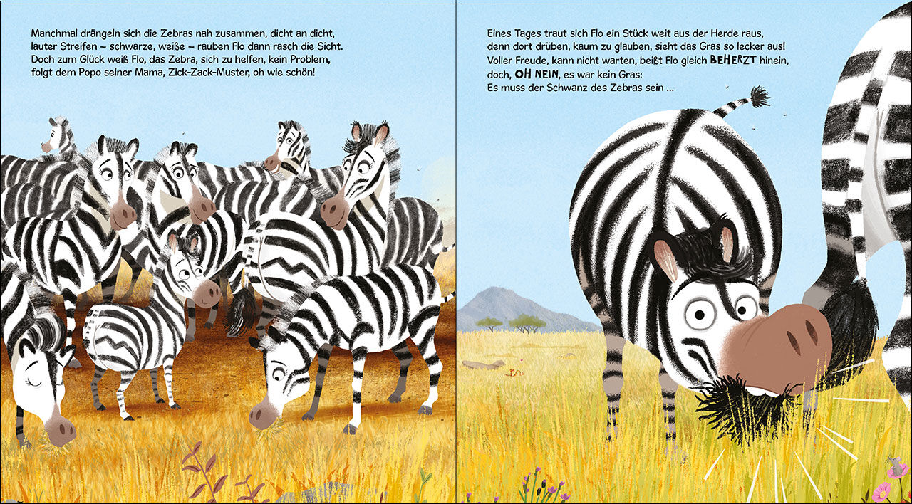 Wo ist bloß Mamas Po? Gemütlich grasend, umgeben von seiner Herde, inmitten der sonnigen Weiten der Savanne: So fühlt sich das Zebra Flo am allerwohlsten! Doch durch ein Missgeschick stürmen alle anderen Tiere plötzlich davon. Zum Glück weiß Flo, wie er seine ...