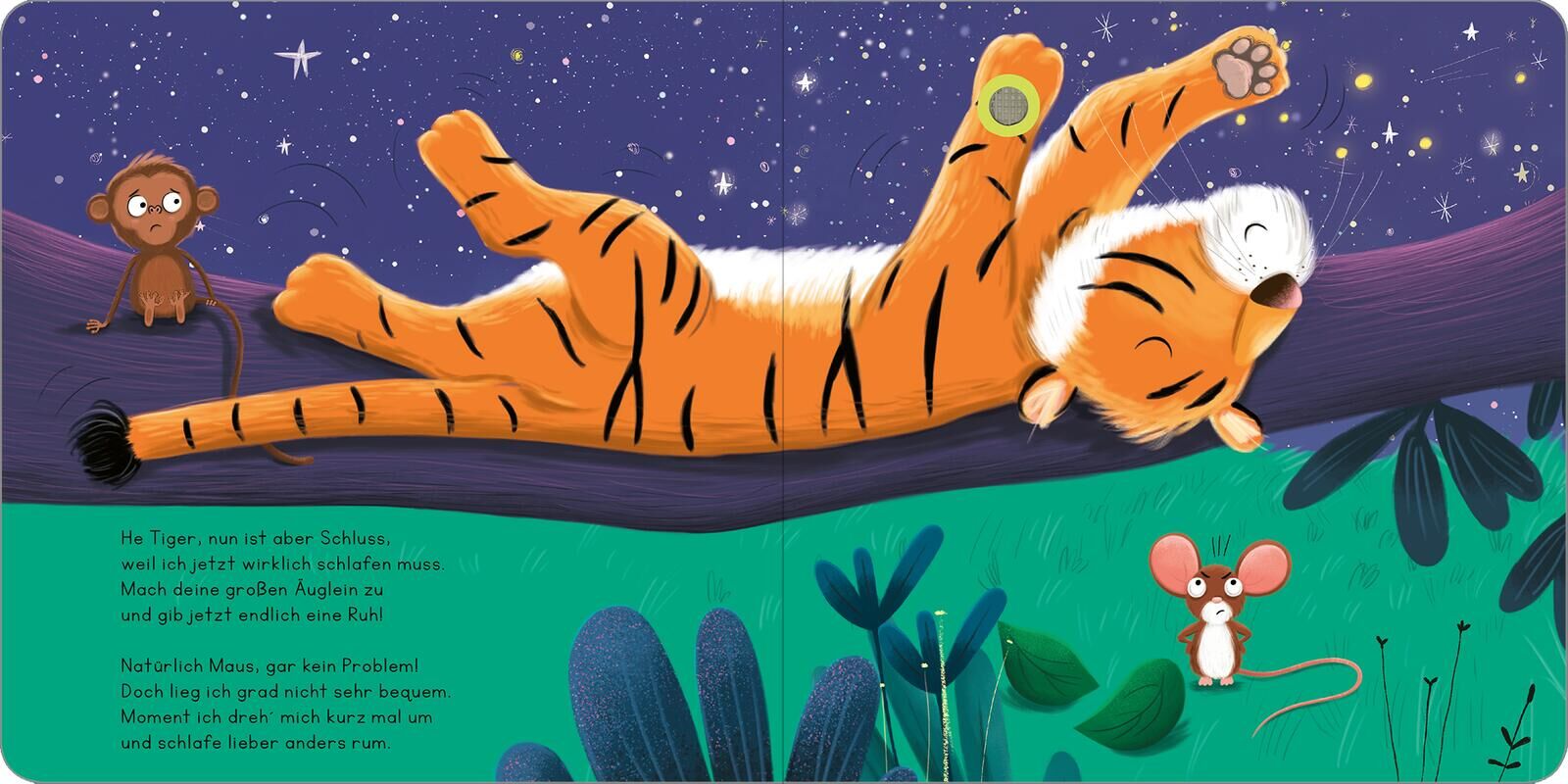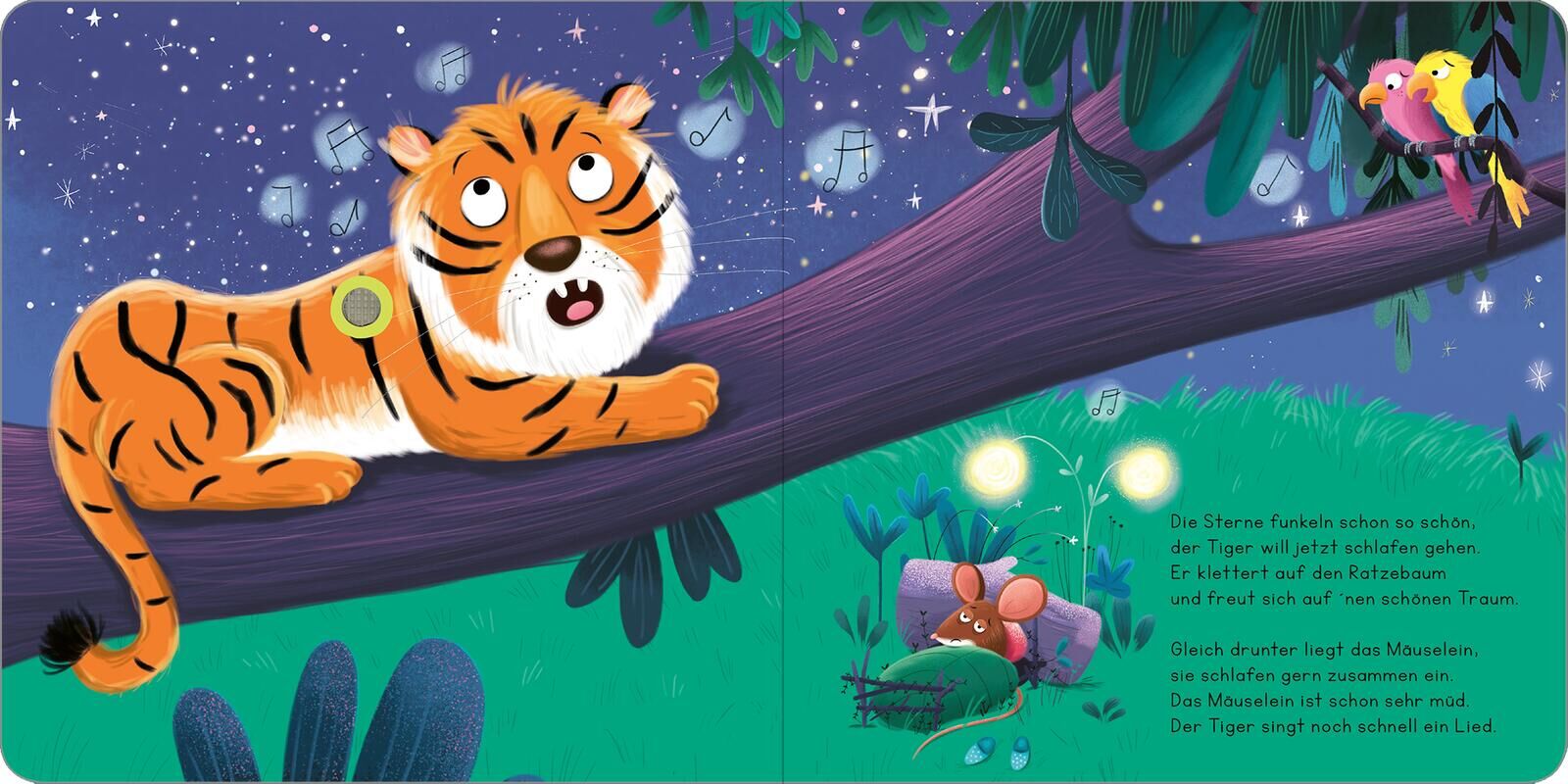 Auch kleine Tiger müssen schlafen gehen! Die Sterne funkeln hell am Himmel. Für Tiger und Maus ist es Zeit, schlafen zu gehen. Nur blöd für die kleine Maus, dass sich ihr Bettchen direkt unter Tigers Ast befindet. Der muss nämlich noch schnell ein Lied trälle...