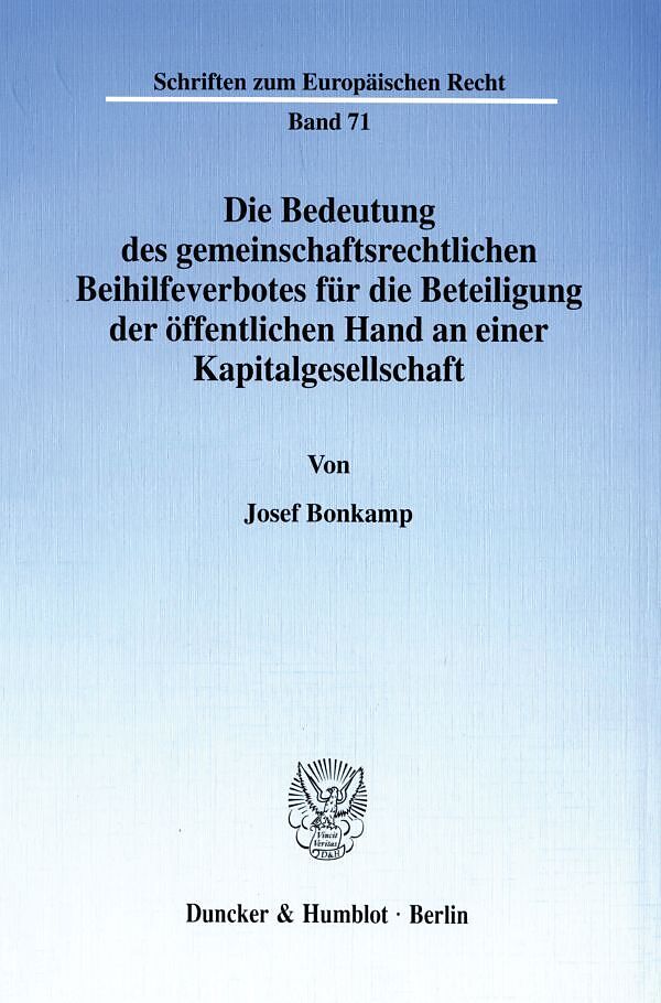 Im letzten Jahrzehnt hat die Kommission der Europäischen Gemeinschaften die Kontrolle staatlicher Beihilfen erheblich ausgeweitet. Dabei stehen auch Kapitalbeteiligungen der öffentlichen Hand an Unternehmen immer wieder im Mittelpunkt des Interesses, wie aus d...