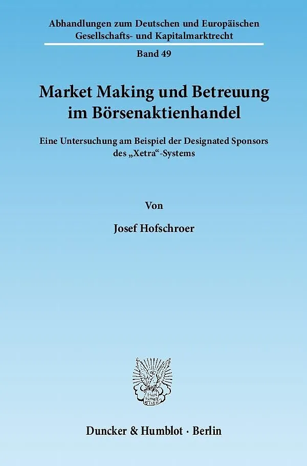 Market Maker sind heute in nahezu allen börsenmäßig organisierten Märkten die entscheidenden Intermediäre, die einen liquiden Handel garantieren. Dennoch sind ihre Rechte und Pflichten nicht speziell gesetzlich geregelt und bisher auch nicht rechtswissenschaft...