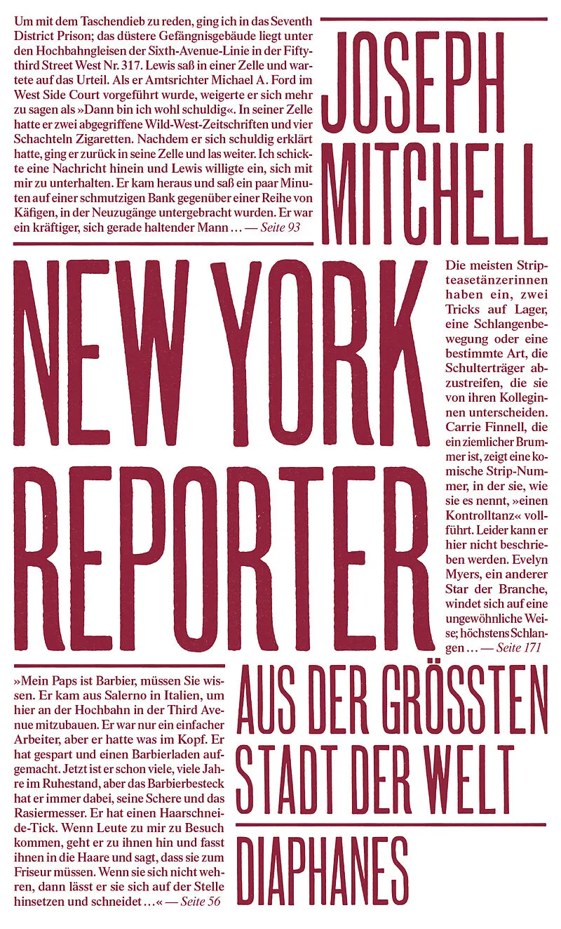 Am Tag des großen Börsenkrachs 1929 trifft Joseph Mitchell in New York ein. Er ist ganze einundzwanzig Jahre alt. Als Reporter für The Herald Tribune und The World-Telegram berichtet er bald über Sportereignisse, Mordprozesse, Unfälle, Trivialitäten und über seine Lieblingsthemen: Randexistenzen, Spinner, Exzentriker. Ob es eine Preisboxerin ist, ein hochintelligenter Gangster oder ein Voodoo-Zauberer, die Ausläufer der italienischen Anarchistenbewegung, der Lindbergh-Prozess oder Burlesque-Clubs: Sie alle schildert Joseph Mitchell mit Enthusiasmus, Empathie, einer ordentlichen Portion Humor und großer Detailfreude. So entsteht ein vielstimmiges Panorama des New Yorker Stadtlebens aus der Zeit der Großen Depression.