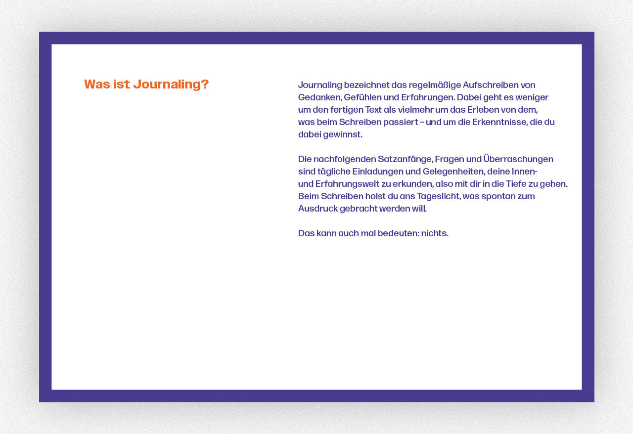 Wer täglich kurz innehält und in sich hineinhorcht, lernt sich besser kennen, stärkt Selbstwahrnehmung und Resilienz. Wer der rauschenden Schnelligkeit des Lebens mit Muße etwas Zeit für Notizen abtrotzt, gewinnt Lebensqualität, steigert Selbstbewusstsein und ...