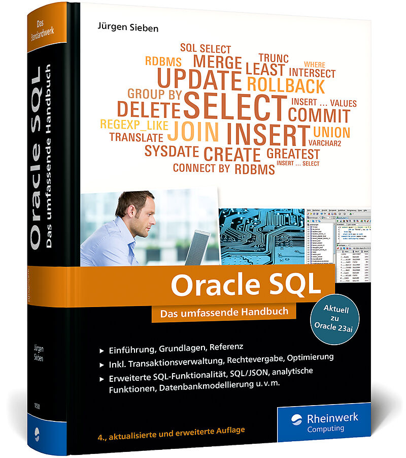 Wenn Sie sich professionell mit Oracle beschäftigen, sind umfassende Kenntnisse des entsprechenden SQL-Dialekts unverzichtbar. Jürgen Sieben, vielen bereits bekannt durch seine Bücher zu Oracle PL/SQL und Oracle APEX, hat nun auch sein Buch zu Oracle SQL aktua...Wenn Sie sich professionell mit Oracle beschäftigen, sind umfassende Kenntnisse des entsprechenden SQL-Dialekts unverzichtbar. Jürgen Sieben, vielen bereits bekannt durch seine Bücher zu Oracle PL/SQL und Oracle APEX, hat nun auch sein Buch zu Oracle SQL aktualisiert. Er zeigt Ihnen darin, wie Oracle und SQL zusammenspielen und welche Strategien Sie nutzen können, um Daten in der Datenbank zu speichern, zu analysieren oder auch zu löschen. Die vierte Auflage berücksichtigt die umfassenden Erleichterungen und Syntaxänderung der Datenbankversion 23ai und gibt auch erfahrenen Anwendern einen profunden Einstieg in die verbesserten Möglichkeiten der Sprache SQL. Aus dem Inhalt: Konzept einer relationalen Datenbank Grundlagen: Auswahl und Projektion Daten aus mehreren Tabellen lesen: Joins Zeilenfunktionen, Gruppenfunktionen, analytische Funktionen Unterabfragen Datenmanipulation Views, Tabellen und Indizes erstellen Einführung in die Rechteverwaltung von Oracle Hierarchische Abfragen und XML-Abfragen Die Model-Klausel Row Pattern Matching Pivotierung und Abfragetabellen Arbeit mit großen Datenstrukturen Performanzoptimierung von SQL-Abfragen Normalisierung von Datenmodellen Häufige Fehler der Datenmodellierung Parameter verwalten Multilinguale Daten