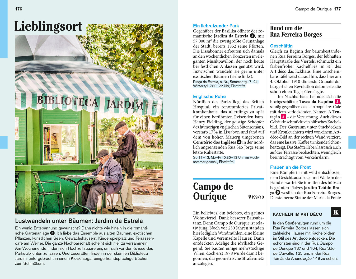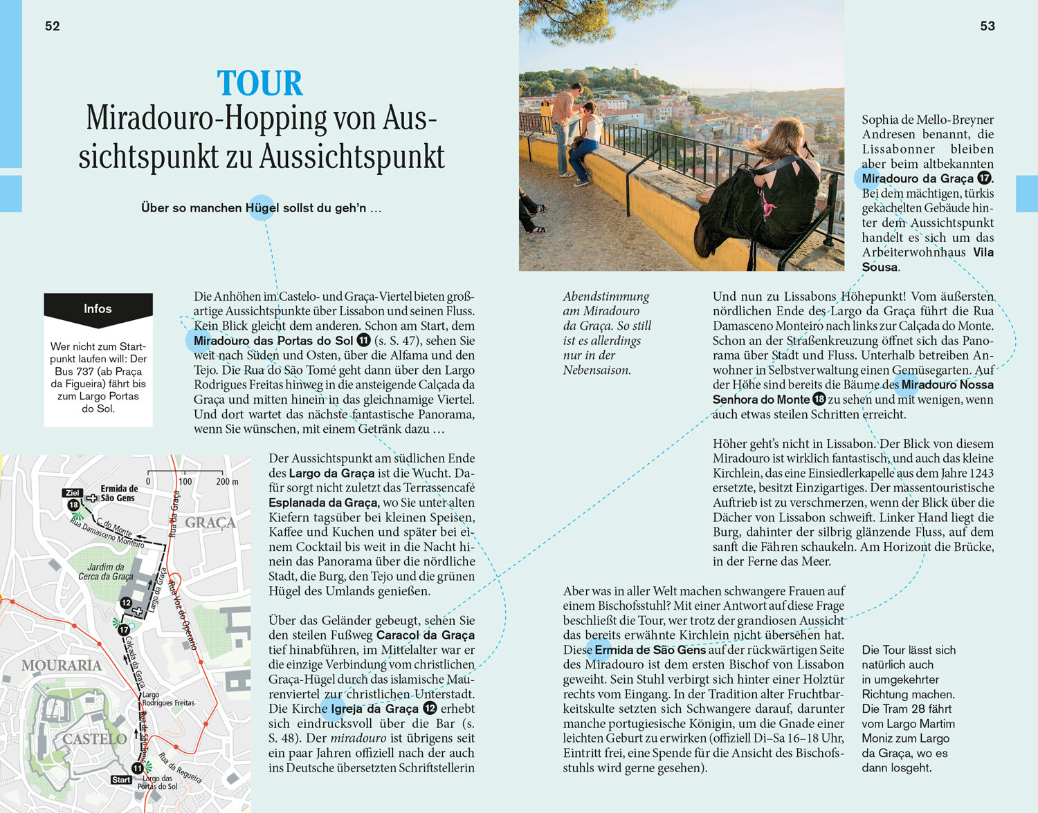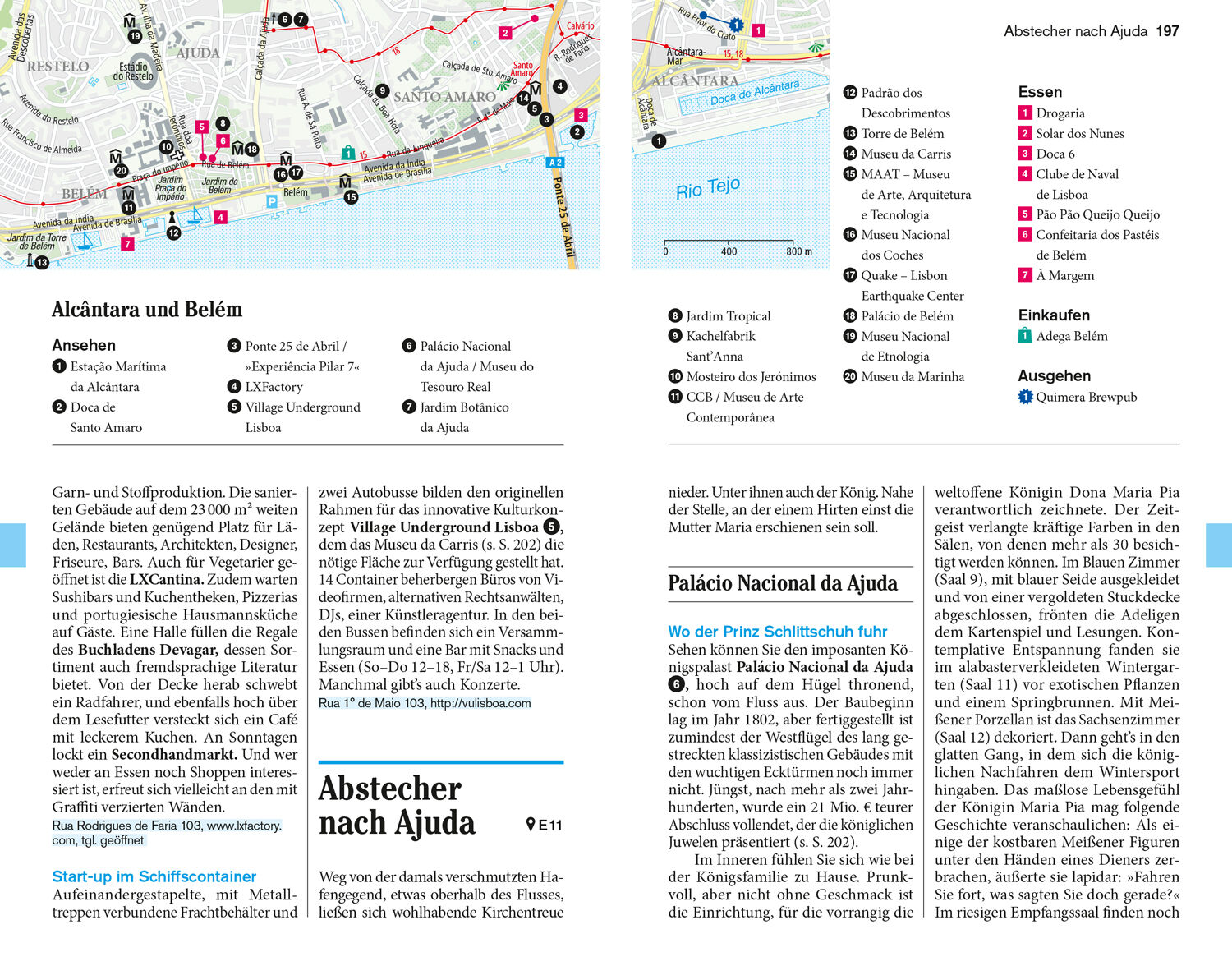 Vor Ort die Stadtviertel samt persönlichen Adresstipps: Mouraria, Castelo, Graça und Alfama, Baixa und Chiado, Bairro Alto, Príncipe Real und Cais do Sodré, Avenidas Novas, Parque das Nações und Expo-Gelände, Westlich des Zentrums, Alcântara und Belém, Ausflüge in die Umgebung. Das Kleingedruckte (Reiseinfos von A bis Z). Das Magazin. Offene Fragen.