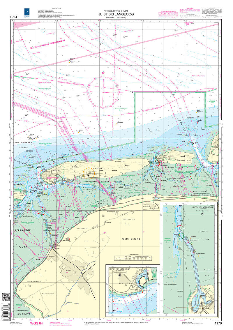 Amtliche deutsche Seekarte des Bundesamtes für Seeschifffahrt und Hydrographie für den Bereich von Juist, Borkum und Langeoog (Ostfriesische Inseln).
