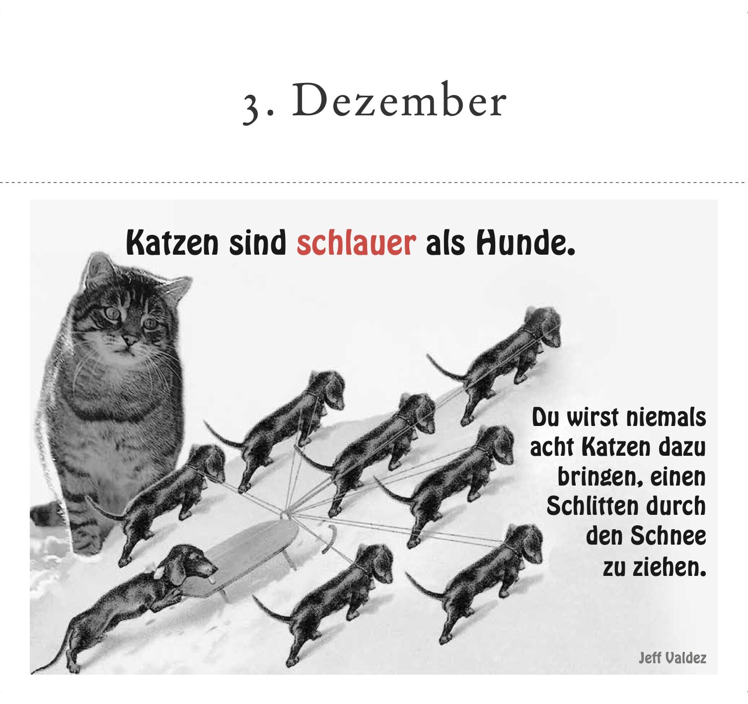 Hier können Sie einen Blick in den Kalender werfen. Jeden Tag begleitet Sie eine Katze und ein literarisches Zitat und die Freude daran lässt sich weitergeben. Ein Adventskalender, der mehr Katzen in der Weihnachtspost beschert! Ein literarischer Katzen-Count...