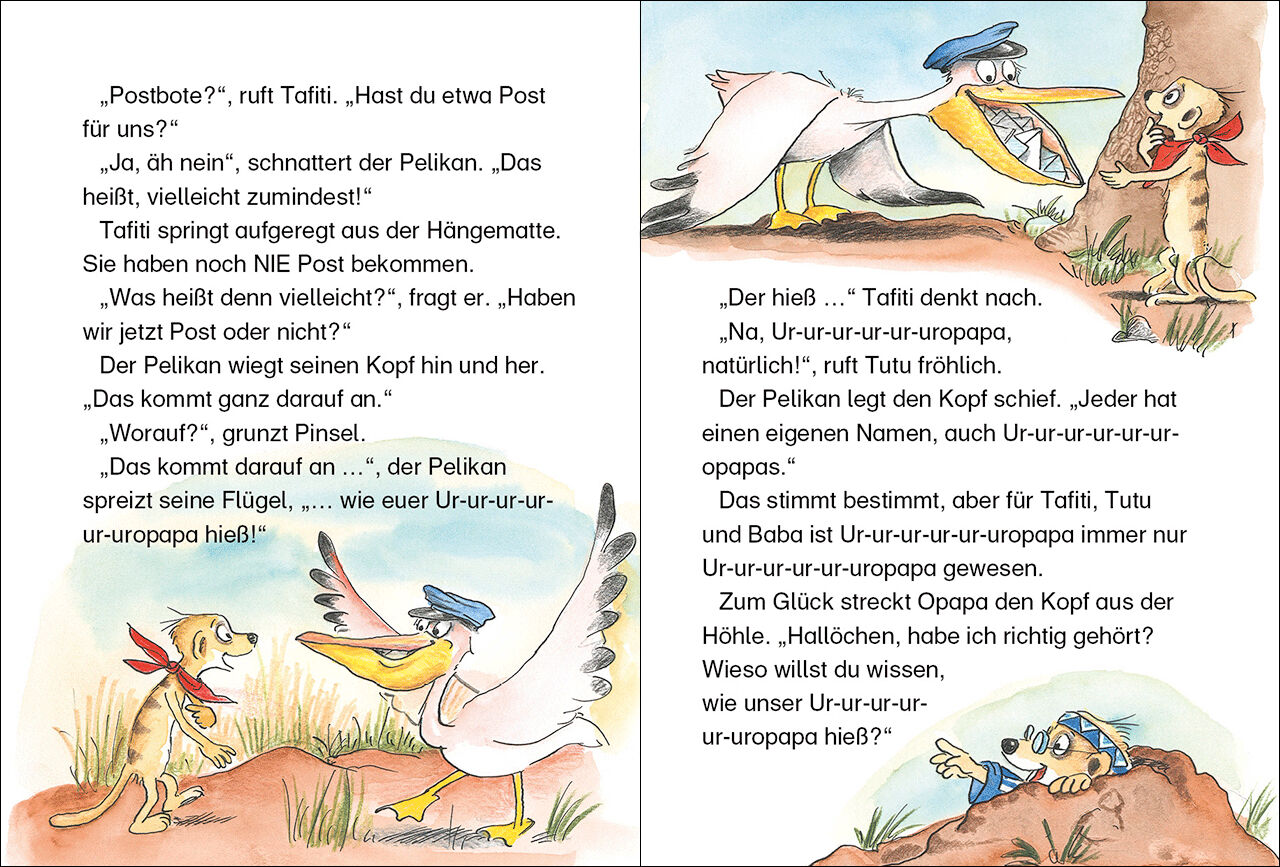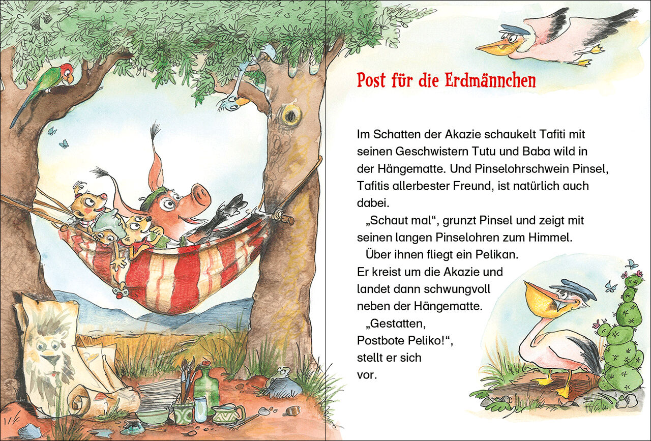 Tafiti und Pinsel gehen zusammen durch dick und dünn! Ein Brief? Für Tafiti und seine Familie? Tatsächlich. Entfernte Verwandte, möchten sie besuchen. Die Freude über das Wiedersehen ist riesengroß. Doch die Besucher sind mit den Gefahren, die in der Savanne l...