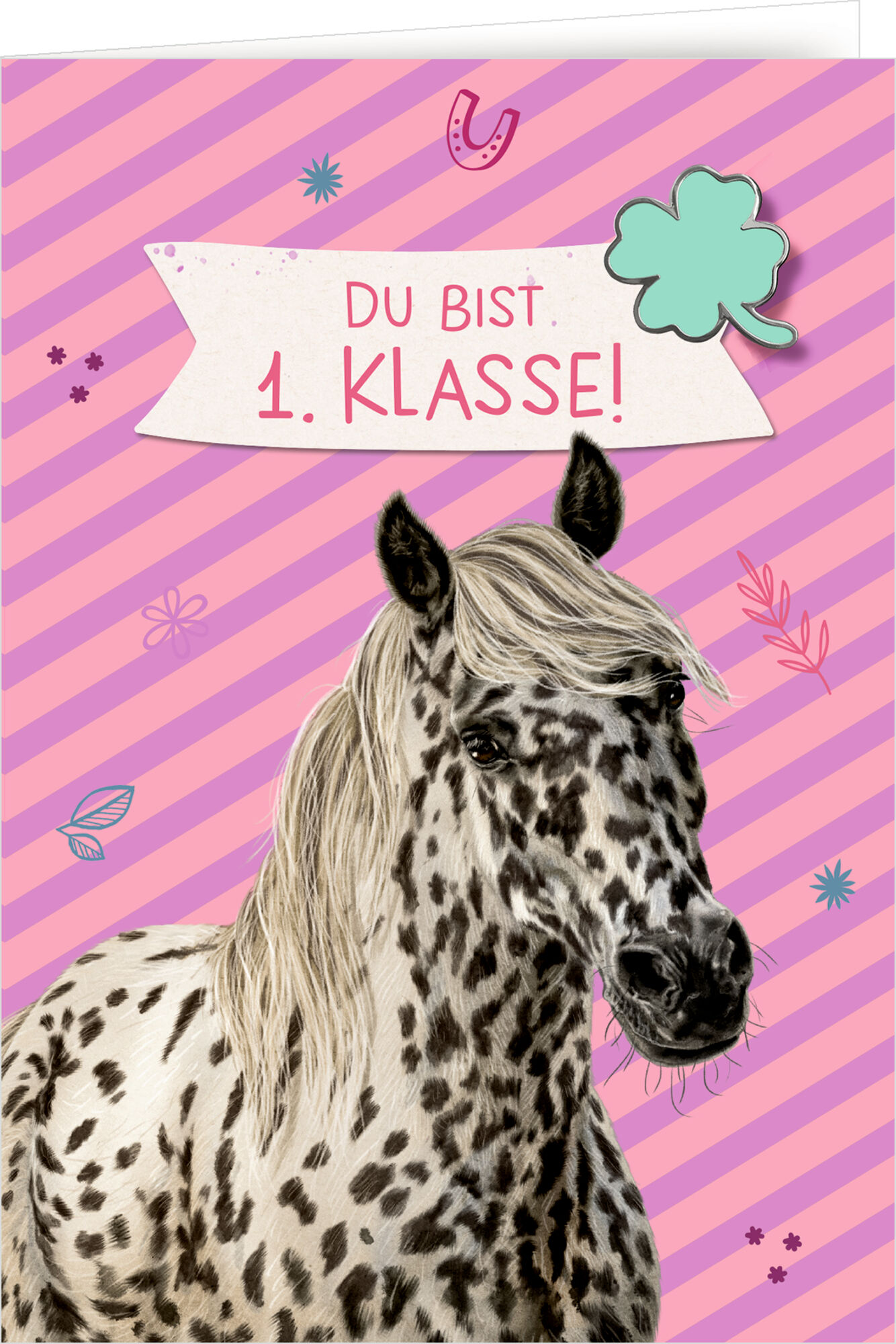 Glückwunschkarte zur Einschulung mit Mutmacher-Pin Hufeisen oder Kleeblatt Klappkarte im DIN-A6-Format mit Kuvert mit beschreibbarer, weißer Innenseite für persönliche Worte Mutmacher-Pin (Hufeisen oder Kleeblatt) zum Anstecken oder Aufbewahren Emotionales Ge...