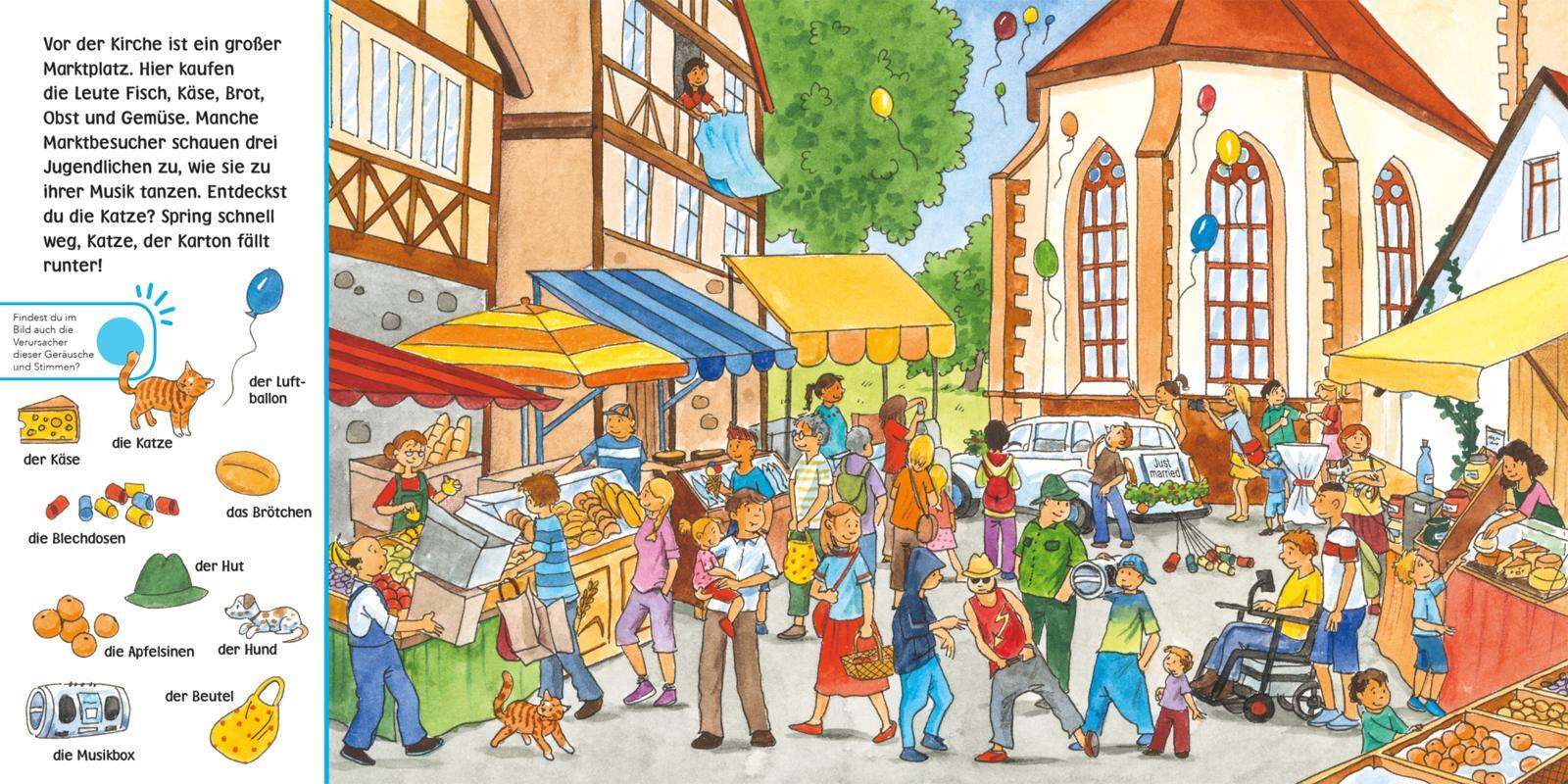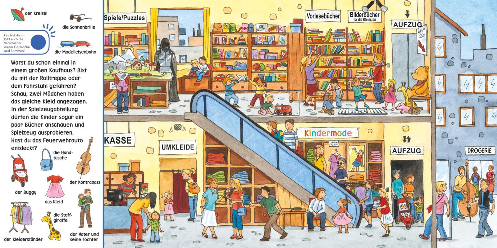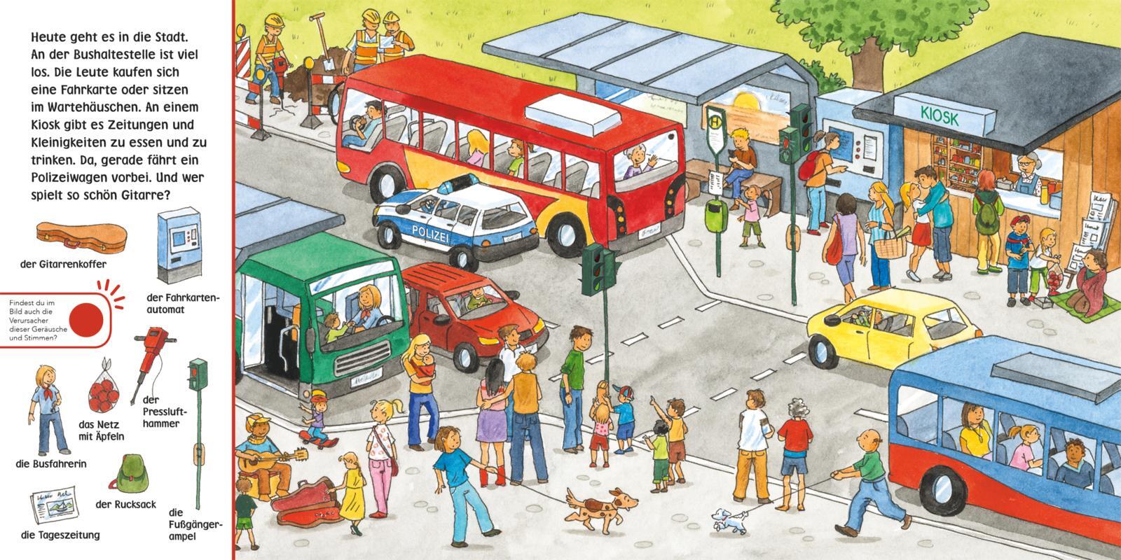 Hör mal (Soundbuch): Wimmelbuch: In der Stadt Das ist neu: Ein Wimmelbuch mit Rätsel-Geräuschen! Mehr als 30 Sounds laden dazu ein, die Stadt zu erkunden. 6 Wimmelbilder rund um Straßenverkehr, Einkaufspassagen, Wochenmarkt, Stadtpark mit Spielplatz und vielem...