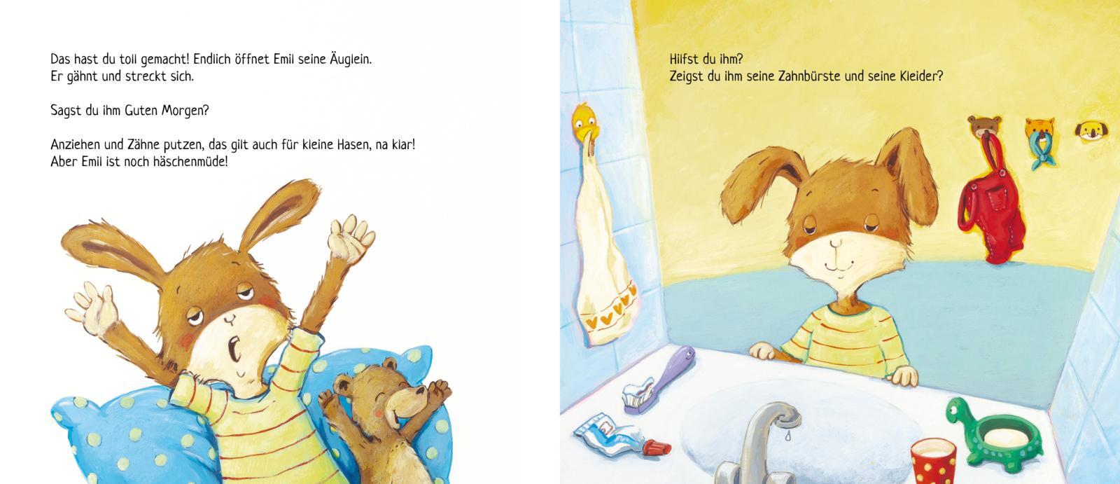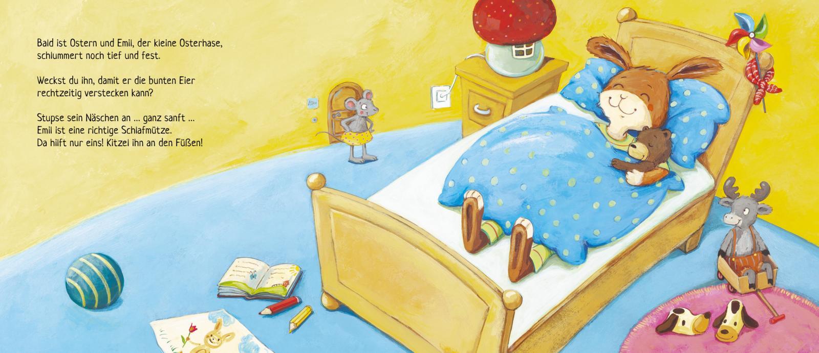 Kitzel das Häschen am Näschen! Liebevolles Oster-Mitmach-Buch für Kinder ab 18 Monaten. Emil, der kleine Osterhase, hat verschlafen! Die Allerkleinsten dürfen ihm beim Anziehen, Ohrenbürsten und Eierbemalen helfen. Einfach über die Seiten streichen, auf das B...