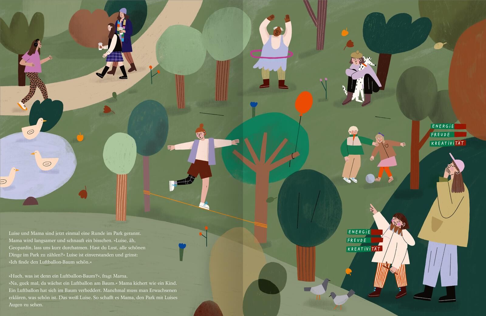 Luise hat einen langen Kindergartentag hinter sich und fühlt sich völlig leer. Alles nervt, nichts macht Spaß. Ihre Spielsachen sind langweilig, Mama ist gestresst und plötzlich kracht es. Da merkt Mama, dass sie selbst dringend eine Pause braucht, genau wie Luise. Gemeinsam gehen sie in den Park, wo frische Luft, bunte Blätter und die Vorstellung, so schnell wie ein Geopard zu rennen, Luises Laune aufhellen. Beim Rennen, Toben und Entdecken laden beide ihre Batterien wieder auf. Aus der Wut wird Freude, aus Langeweile wird Kreativität. Am Ende basteln Luise und ihre Mama eine Schatzkarte mit all den schönen Dingen, die sie entdeckt haben und erkennen, dass Pausen wahre Schätze sind.