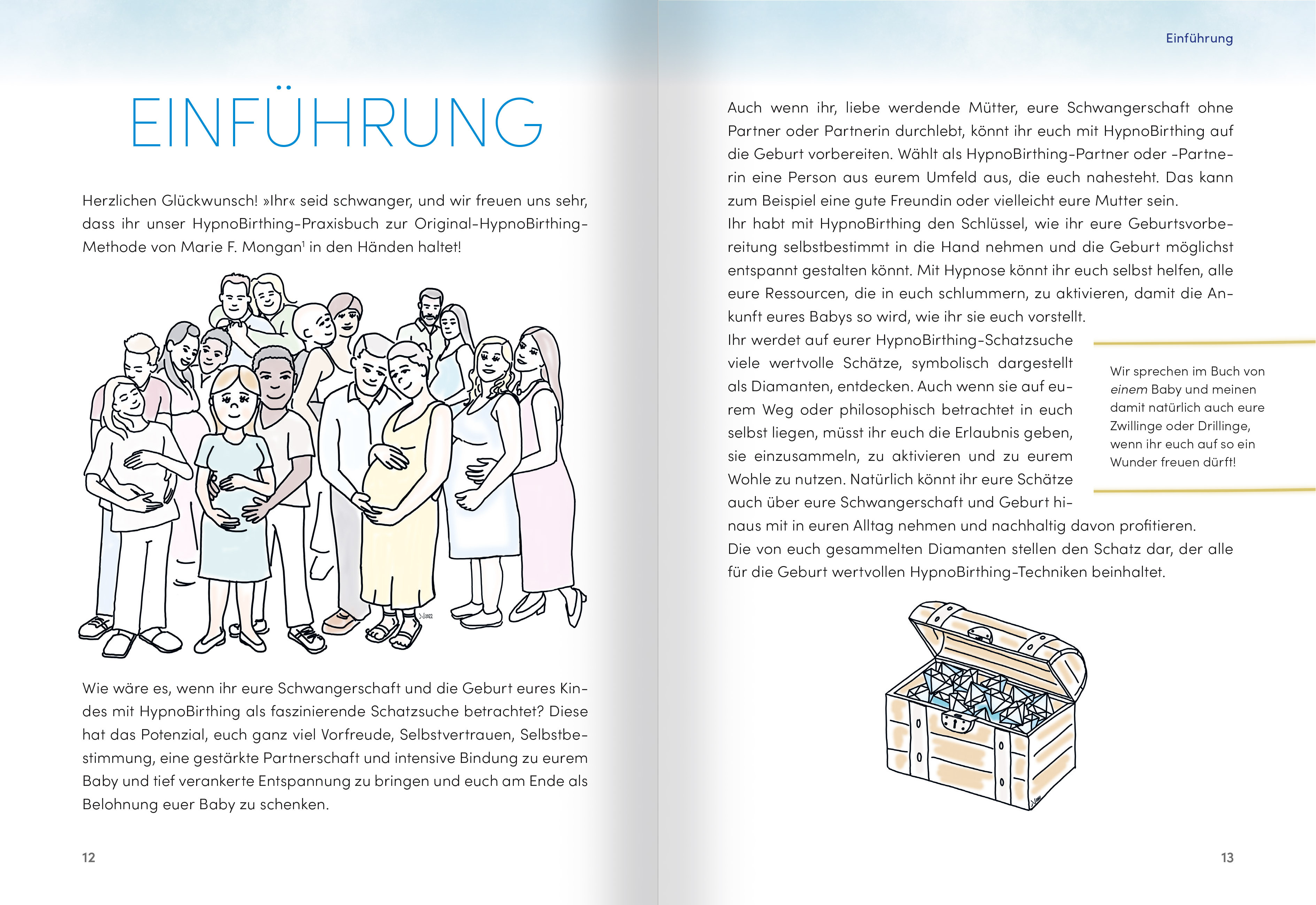 VORWORT Liebe Leserinnen und Leser, Marie F. Mongan hat unserer Welt mit "HypnoBirthing" einen wertvollen Schatz hinterlassen. Es war ihr Traum, möglichst vielen Frauen zu helfen, mit Selbsthypnose eine sichere, sanfte und leichte Geburtserfahrung machen zu dürfen. Ihre Originalmethode hat sich seit 1990 weltweit verbreitet und als sichere Methode bewährt. Auch im deutschsprachigen Raum haben ihr Original-HypnoBirthing-Buch und die HypnoBirthing- Kurse der HypnoBirthing Gesellschaft Europa (HBGE) bereits Tausenden Frauen und ihren Partnern und Partnerinnen bei der angstfreien und entspannten Vorbereitung und den Geburten ihrer Kinder geholfen. Es ist unser Traum, mit unserem Praxisbuch viele werdende Familien noch besser zu unterstützen, das volle Potenzial des HypnoBirthing- Schatzes von Marie Mongan zu entdecken, um bestmöglich davon zu profitieren. Wir haben die Notwendigkeit gesehen, ein ansprechendes und modernes Praxisbuch zum Originalwerk zu schreiben, das leicht zu lesen sowie liebevoll farbig bebildert ist. Es soll Eltern einen praktischen Mehrwert in Form von Übungen, Checklisten und Wochenplänen bieten. Außerdem finden sich in unserem Buch wissenschaftliche Infoboxen, ein aufschlussreicher Selbsttest, zehn Praxiskarten und viele praktische Tipps, zum Beispiel zur Baby-Erstausstattung oder Vorbereitung des Wochenbetts und Stillens. Ihr könnt mit unserem Praxisbuch Schritt für Schritt lernen, euch mit Marie F. Mongans bewährten HypnoBirthing-Techniken individuell an eure Vorlieben angepasst vorzubereiten. Darüber hinaus findet ihr gezielte Anleitungen, Empfehlungen und Trainingspläne zum Üben der verschiedenen Techniken bzw. zum selbstbestimmten Anwenden von Selbsthypnose. Wir möchten euch dabei unterstützen, möglichst tiefe Entspannung und Wohlbefinden zu verankern. Dies bedeutet, dass ihr alles Positive, was ihr euch für die Geburt eures Babys (oder eurer Mehrlinge) wünscht, so gut wie möglich abrufen könnt. Wir möchten euch auch helfen, eure Intuition zu aktivieren und das Vertrauen in eure Fähigkeiten und eure Bindung zu eurem Kind zu stärken. Das Ziel von HypnoBirthing ist es, dass ihr mithilfe von Selbsthypnose aktiv und selbstbestimmt, voller Vertrauen und entspannt das Beste aus eurer Geburt machen könnt. Wir wünschen euch eine wunderbare gemeinsame Zeit der Vorbereitung und Vorfreude auf euer Baby, eine schöne HypnoBirthing-Geburt und großartige Zeit als Eltern bzw. als Familie! Wenn ihr wollt, muss HypnoBirthing auch nicht mit der Geburt aufhören, denn alle HypnoBirthing-Schätze, die ihr entdecken werdet und mit denen ihr u. a. Entspannung verankern möchtet, haben das Potenzial, dass ihr es euch auch nach der Geburt entspannt gut gehen lassen könnt. Julia und Matthias Maak