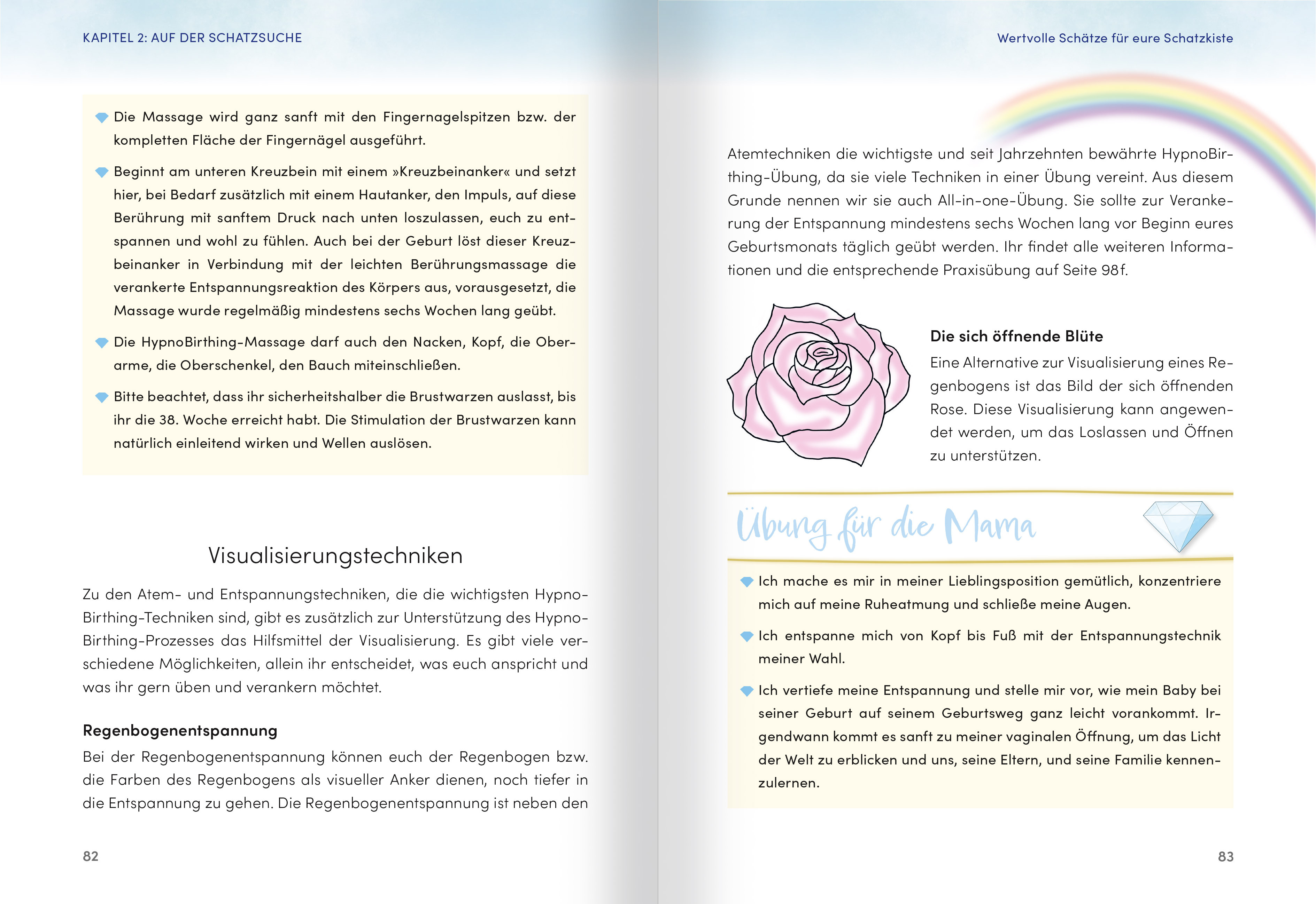 (Auszug aus "Kapitel 2: Auf der Schatzsuche") WERTVOLLE SCHÄTZE FÜR EURE SCHATZKISTE Ihr könnt aus einer Vielzahl verschiedener HypnoBirthing-Schätze Übungen auswählen. Diese können nach Marie Mongan in folgende Grundtechniken eingeteilt werden: Atmung, Entspannung, Vertiefung der Entspannung, Visualisierung und Affirmationen. ATEMTECHNIKEN Unsere Atmung ist unser wichtigster Schlüssel, wenn wir uns erfolgreich entspannen möchten. Sobald wir langsam und bewusst tief in unseren Bauch atmen, aktivieren wir unseren Parasympathikus und damit die Ausschüttung unserer Wohlfühlhormone. Wir konzentrieren uns auf unsere Atmung und wie wir sie wahrnehmen, und sind dadurch automatisch im Hier und Jetzt und nicht bei "Was wäre, wenn ?" oder "Was könnte sein ?". Über tausend Mütter haben die HypnoBirthing-Atemtechniken als die Technik bewertet, die ihnen bei ihrer Geburt am meisten geholfen hat.68 Es ist also sehr wichtig und wertvoll, sie gut zu üben (lieber früher beginnen, spätestens ab der 32. Schwangerschaftswoche täglich). Dadurch könnt ihr die Atmung und Entspannung verankern und bei der Geburt bestmöglich abrufen. Wir sind im Alltag oder in stressigen Situationen schnell bei einer flachen, schnellen Brustatmung. Bevor ihr die Ruheatmung das erste Mal übt, empfehlen wir euch, als Vorübung erst einmal eure Bauchatmung bewusst zu aktivieren. Das könnt ihr tun, indem ihr euch bequem hinsetzt, eure Fußsohlen liegen ganz auf dem Boden auf, und eure Hände liegen auf euren Oberschenkeln oder auf eurem Bauch. Alternativ in jeder bequemen Position. Ihr atmet tief ein, so, wie es euch guttut. Dann atmet ihr mit einem Seufzer aus und lasst dabei eure Schultern los. Ihr wartet, bis euer Atemreflex euch wieder zur nächsten Einatmung führt. Diese ist dann automatisch eure aktivierte Bauchatmung. RUHEATMUNG Mit der Ruheatmung könnt ihr euch jederzeit in der Schwangerschaft und auch bei der Geburt in euren Wellenpausen entspannen, Wohlfühlhormone ausschütten, euch und euer Baby gut mit Sauerstoff versorgen und in eurer Kraft bleiben. Die Ruheatmung hat darüber hinaus auch das Potenzial, euch später im Alltag mit Baby oder im Job bei der Entspannung zu helfen. Viele Eltern berichten uns, dass sie und ihre Babys sich beruhigen, wenn sie nach der Geburt die Ruheatmung anwenden. Viele können mithilfe der Ruheatmung auch besser einschlafen. Übung: (...)