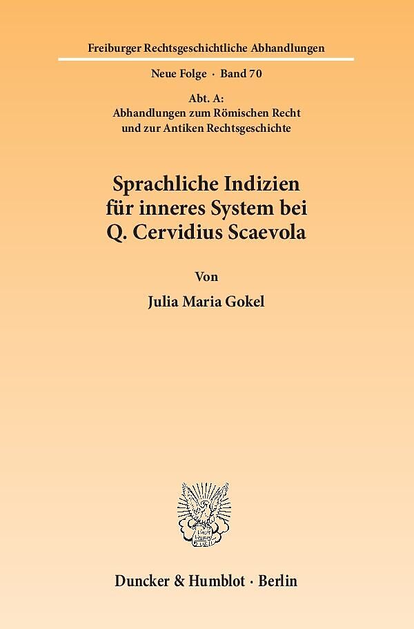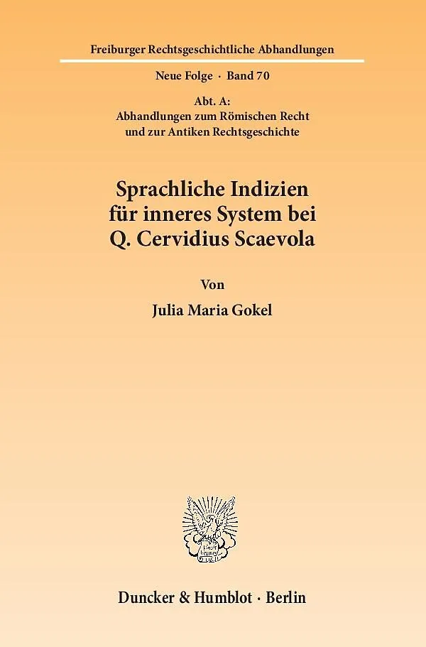 Gegenstand der Untersuchung von Julia Maria Gokel ist die Frage nach innerer Systembildung im Werk des römischen Juristen Quintus Cervidius Scaevola. Die Forschungsarbeit, welche auf einem philologischen Ansatz basiert, untersucht systemrelevante Quellenstellen aus nahezu allen Werken des Juristen auf eine über den Einzelfall hinausgehende Verknüpfung der juristischen Entscheidung und unterteilt die untersuchten Quellen nach Argumentationsgruppen. Die detaillierten Exegesen, welche das Kernstück der Arbeit bilden, sind thematisch nicht begrenzt und stellen einen bunten Querschnitt von Fällen aus den verschiedensten Gebieten des römischen Rechts dar. Die Wahl, das Corpus eines Juristen zu untersuchen, welcher in der Übergangszeit von der antoninischen zur severischen Periode in Rom lebte und nicht selten über Anfragen in griechischer Sprache entschied, ermöglicht zudem die konkrete Untersuchung des Einflusses von griechischem Rechtsdenken anhand verschiedener Rechtsinstitute des ius gentium. Wo sich vereinzelt systembildende Strukturen in den Entscheidungen des Juristen nachweisen lassen, kommt die Autorin zu dem Ergebnis, dass es sich überwiegend um didaktisch motivierte Darstellungen für Unterrichtszwecke handelt. Die Untersuchung bestätigt insgesamt das Juristenprofil Scaevolas als eines in der Regel praxisorientierten Respondenten mit geringem Interesse für Systembildungsfragen.