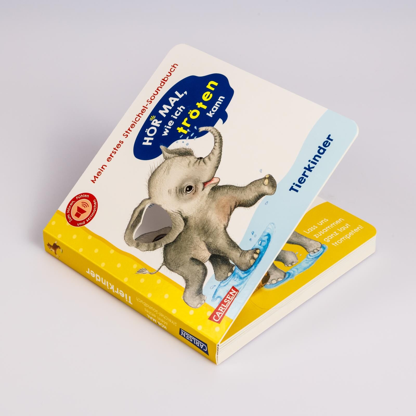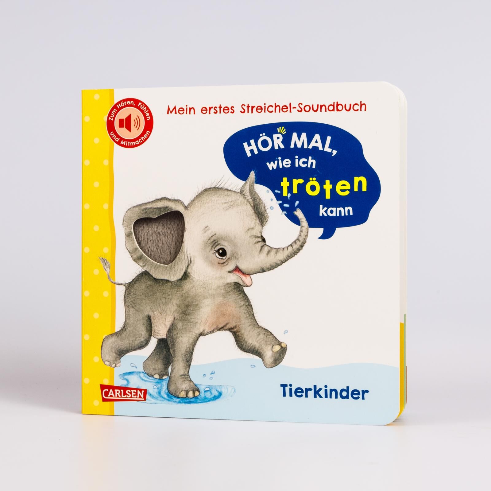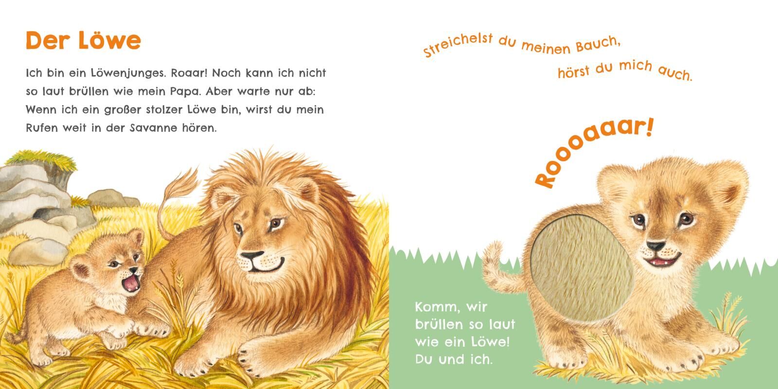 Ein interaktives Fühlbuch mit hochwertigen Illustrationen und Sounds, das schon die Kleinsten begeistert. Auf fünf Doppelseiten werden die Jungen von Elefant, Löwe, Ziege, Pferd und Pinguin in kurzen, kindgerechten Sachtexten vorgestellt. Ein Reim fordert dazu auf, das weiche Fell zu streicheln und so die Tierlaute auszulösen: Streichelst du meinen Bauch, dann hörst du mich auch! Das Fohlen wiehert fröhlich, wenn über sein Fell gestrichen wird. Zum Schluss werden die Kinder zum Mitmachen animiert: Komm, wir wiehern zusammen!