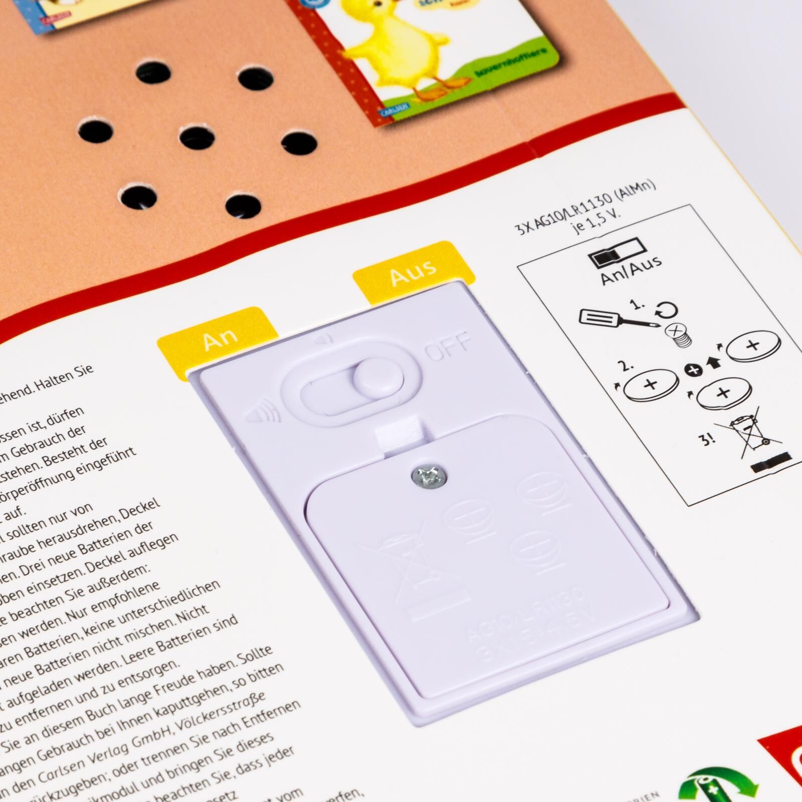 Ausgeliefert werden die Bücher mit drei handelsüblichen Knopfzellen-Batterien vom Typ LR1130 mit jeweils 1,5 V.