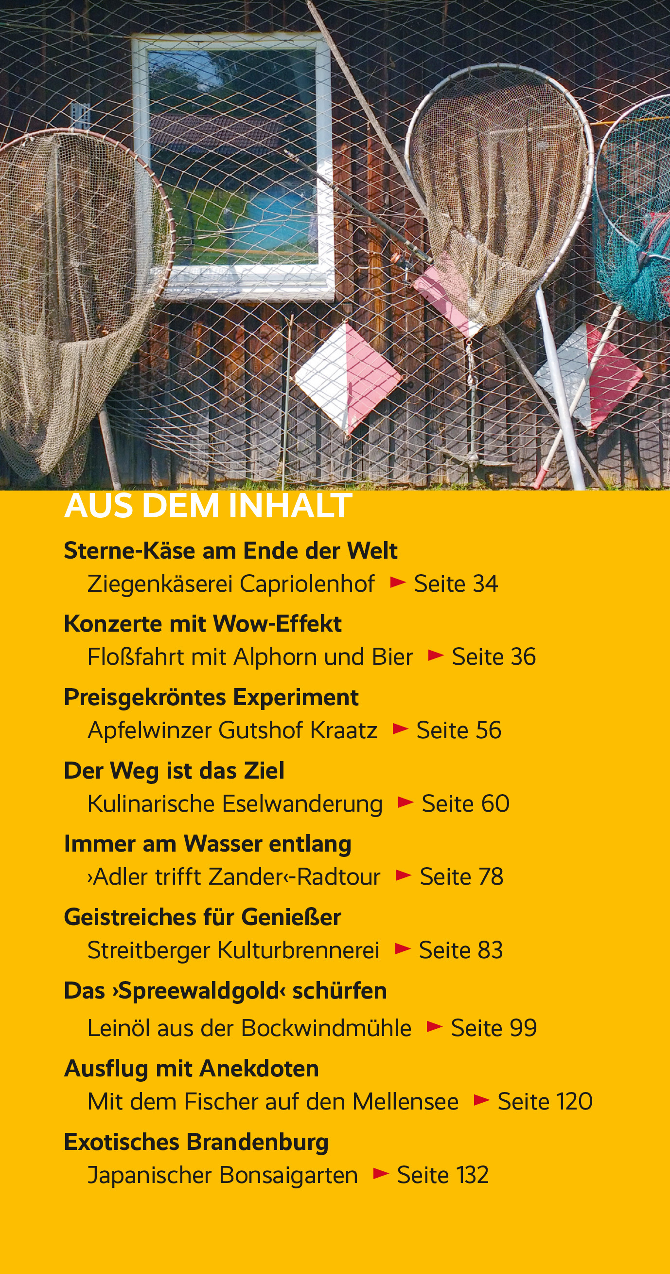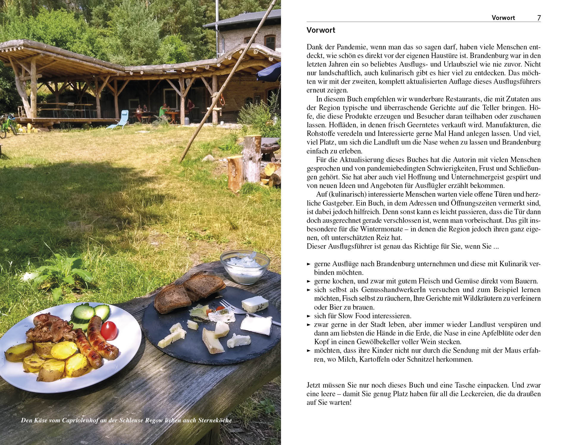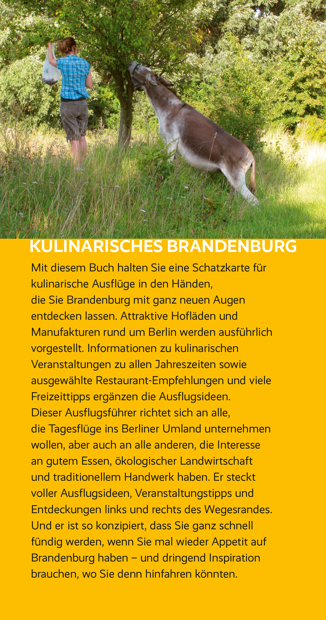 Seite 34 KONZERTE MIT WOW-EFFEKT Floßfahrt mit Alphorn und Bier > Seite 36 PREISGEKRÖNTES EXPERIMENT Apfelwinzer Gutshof Kraatz > Seite 56 DER WEG IST DAS ZIEL Kulinarische Eselwanderung > Seite 60 IMMER AM WASSER ENTLANG "Adler trifft Zander"-Radtour > Seite 78 GEISTREICHES FÜR GENIEßER Streitberger Kulturbrennerei > Seite 83 DAS "SPREEWALDGOLD" SCHÜRFEN Leinöl aus der Bockwindmühle > Seite 99 AUSFLUG MIT ANEKDOTEN Mit dem Fischer auf den Mellensee > Seite 120 Exotisches Brandenburg Japanischer Bonsaigarten > Seite 132 Mit diesem Buch halten Sie eine Schatzkarte für kulinarische Ausflüge in den Händen, die Sie Brandenburg mit ganz neuen Augen entdecken lassen. Attraktive Hofläden und Manufakturen rund um Berlin werden ausführlich vorgestellt. Informationen zu kulinarischen Veranstaltungen zu allen Jahreszeiten sowie ausgewählte Restaurant-Empfehlungen und viele Freizeittipps ergänzen die Ausflugsideen. Dieser Ausflugsführer richtet sich an alle, die Tagesflüge ins Berliner Umland unternehmen wollen, aber auch an alle anderen, die Interesse an gutem Essen, ökologischer Landwirtschaft und traditionellem Handwerk haben. Er steckt voller Ausflugsideen, Veranstaltungstipps und Entdeckungen links und rechts des Wegesrandes. Und er ist so konzipiert, dass Sie ganz schnell fündig werden, wenn Sie mal wieder Appetit auf Brandenburg haben und dringend Inspiration brauchen, wo Sie denn hinfahren könnten. >>> Detaillierte Informationen zu diesem Trescher-Reiseführer sowie zu vielen anderen Titeln zum Berliner Umland und zu Brandenburg finden Sie auf der Website des Trescher Verlags.