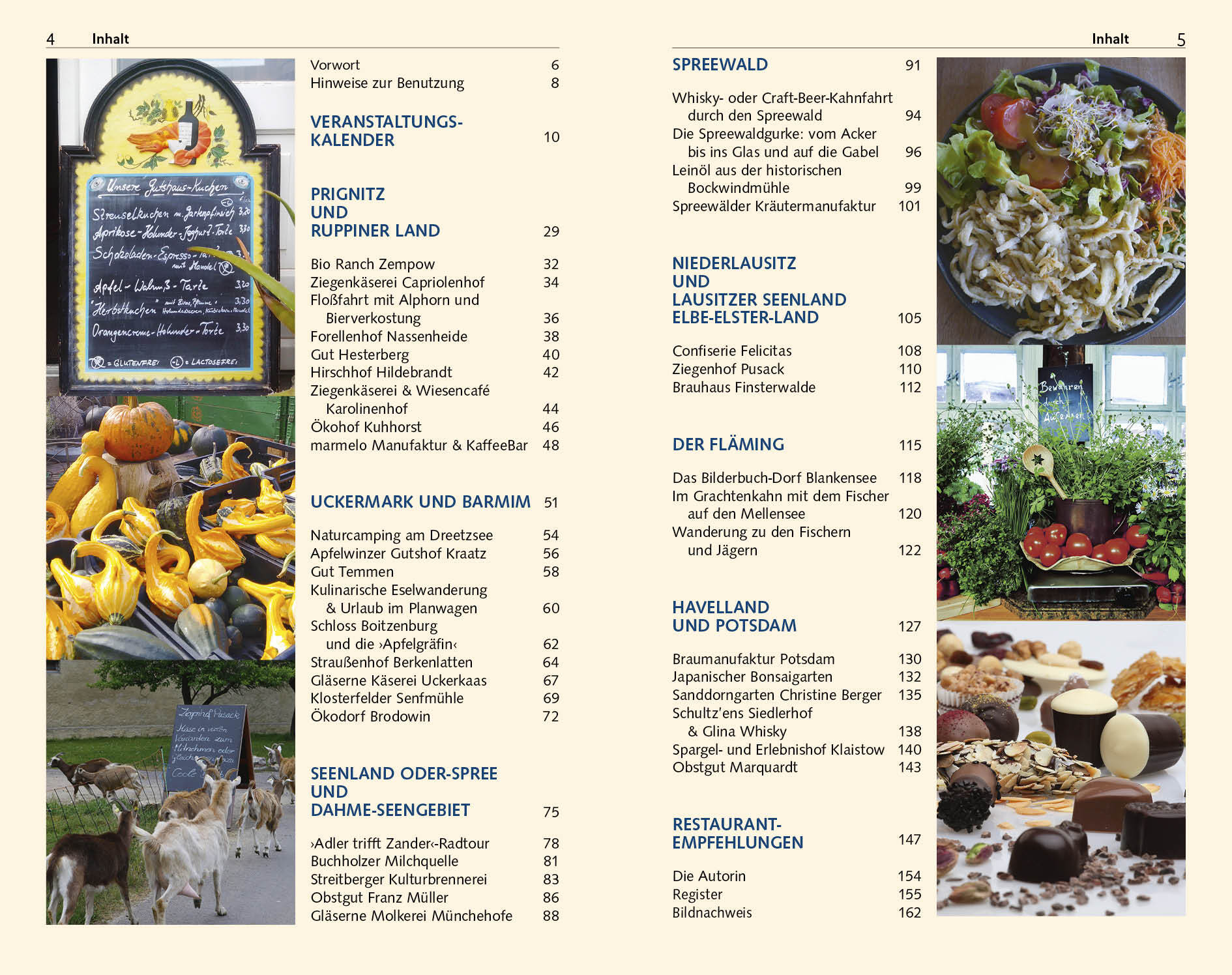 Vorwort 6 Hinweise zur Benutzung 8 VERANSTALTUNGSKALENDER 10 PRIGNITZ UND RUPPINER LAND 29 Bio Ranch Zempow 32 Ziegenkäserei Capriolenhof 34 Floßfahrt mit Alphorn und Bierverkostung 36 Forellenhof Nassenheide 38 Gut Hesterberg 40 Hirschhof Hildebrandt 42 Ziegenkäserei & Wiesencafé Karolinenhof 44 Ökohof Kuhhorst 46 marmelo Manufaktur & KaffeeBar 48 UCKERMARK UND BARMIM 51 Naturcamping am Dreetzsee 54 Apfelwinzer Gutshof Kraatz 56 Gut Temmen 58 Kulinarische Eselwanderung & Urlaub im Planwagen 60 Schloss Boitzenburg und die "Apfelgräfin" 62 Straußenhof Berkenlatten 64 Gläserne Käserei Uckerkaas 67 Klosterfelder Senfmühle 69 Ökodorf Brodowin 72 SEENLAND ODER-SPREE UND DAHME-SEENGEBIET 75 Adler trifft Zander-Radtour 78 Buchholzer Milchquelle 81 Streitberger Kulturbrennerei 83 Obstgut Franz Müller 86 Gläserne Molkerei Münchehofe 88 Spreewald 91 Whisky- oder Craft-Beer-Kahnfahrt durch den Spreewald 94 Die Spreewaldgurke: vom Acker bis ins Glas und auf die Gabel 96 Leinöl aus der historischen Bockwindmühle 99 Spreewälder Kräutermanufaktur 101 NIEDERLAUSITZ UND LAISITZER SEENLAND; ELBE-ELSTER-LAND 105 Confiserie Felicitas 108 Ziegenhof Pusack 110 Brauhaus Finsterwalde 112 DER FLÄMING 115 Das Bilderbuch-Dorf Blankensee 118 Im Grachtenkahn mit dem Fischer auf den Mellensee 120 Wanderung zu den Fischern und Jägern 122 HAVELLAND UND POTSDAM 127 Braumanufaktur Potsdam 130 Japanischer Bonsaigarten 132 Sanddorngarten Christine Berger 135 Schultz'ens Siedlerhof & Glina Whisky 138 Spargel- und Erlebnishof Klaistow 140 Obstgut Marquardt 143 RESTAURANT-EMPFEHLUNGEN 147 Die Autorin 154 Thematisches Register 155 Alphabetisches Register 157 Bildnachweis 162 >>> Detaillierte Informationen zu diesem Trescher-Reiseführer sowie zu vielen anderen Titeln zum Berliner Umland und zu Brandenbur…