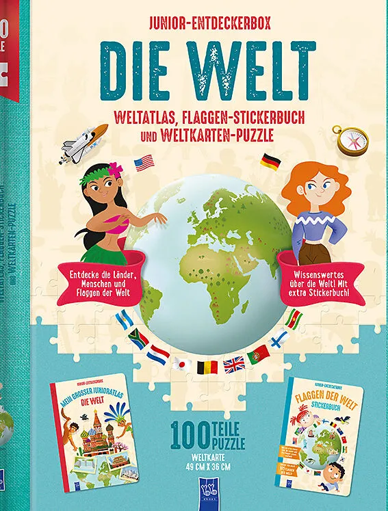 Junior-Entdeckerbox mit 2 Büchern und einem großen 100-teiligen Puzzle. Diese Box zum Thema "Die Welt" enthält die ultimative Sammlung bestehend aus zwei Büchern: ein mit Fakten gefüllter Junior-Atlas und ein Flaggen-Stickerbuch mit Fragen, Fakten und vielen S...