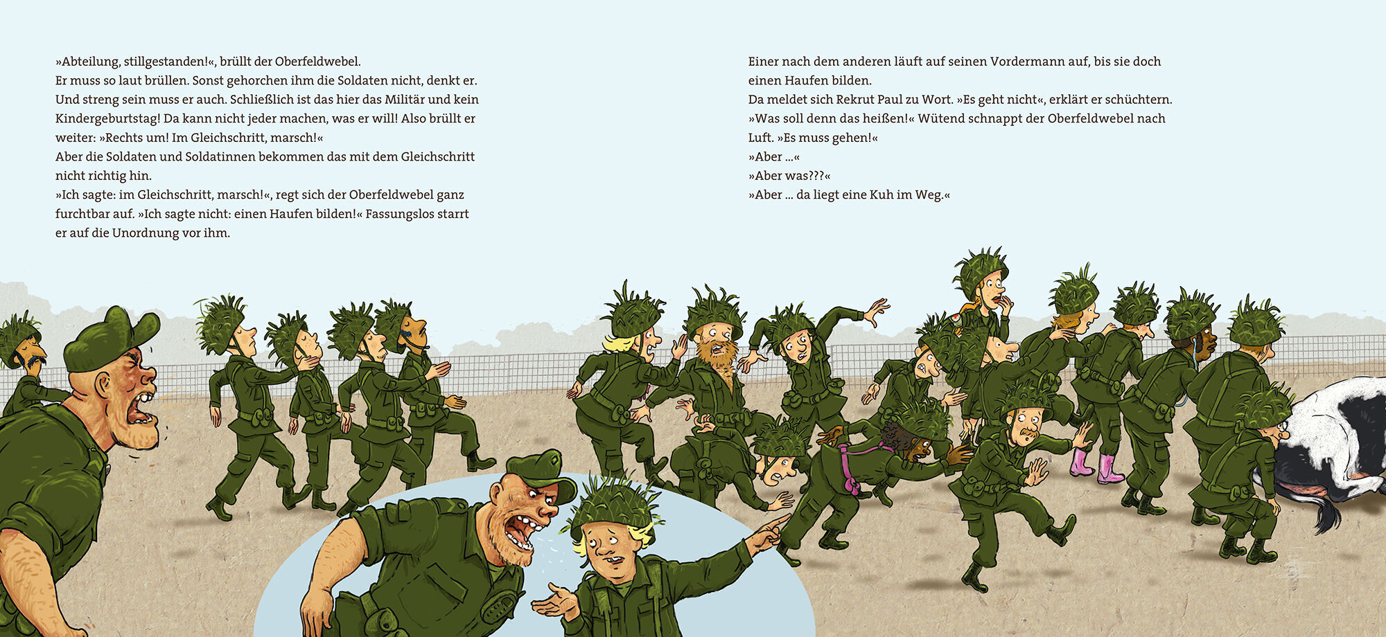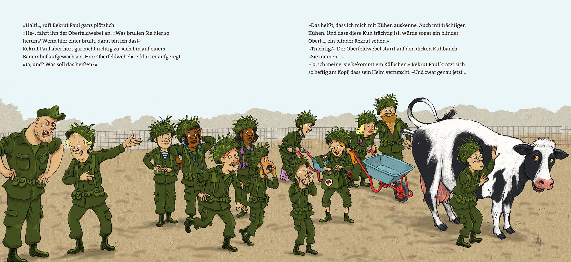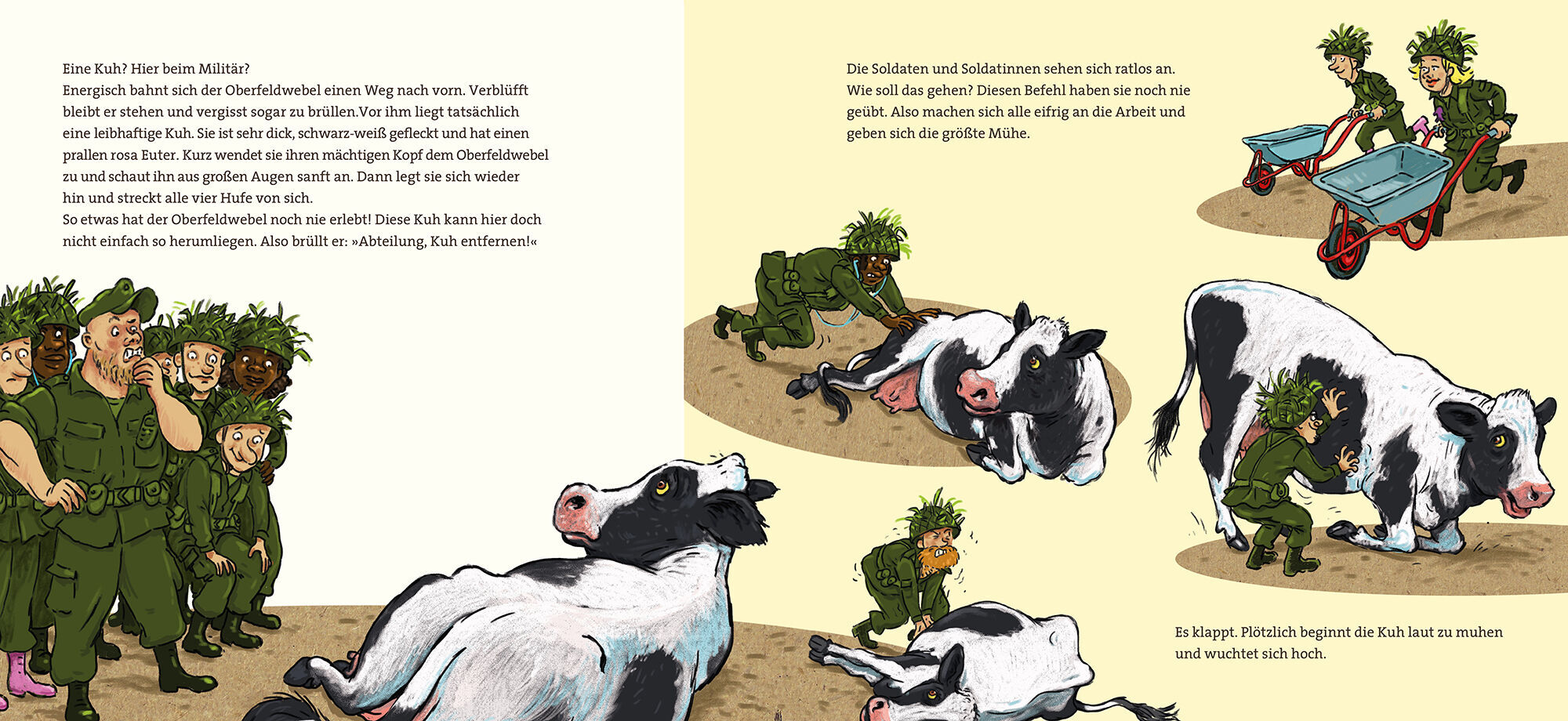 Statt ordentlich und diszipliniert zu marschieren, purzeln die Rekruten fast übereinander: Eine Kuh liegt im Weg, mitten auf dem Truppenübungsplatz. Und ganz egal, wie laut der Oberfeldwebel brüllt: diese Kuh bringt ein Kälbchen zur Welt und zwar genau hier un...