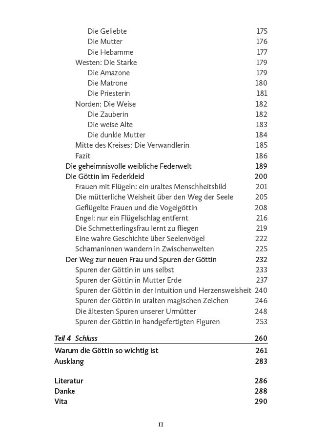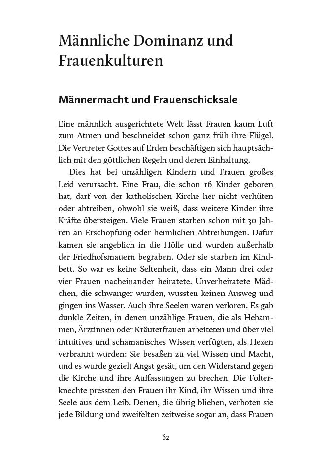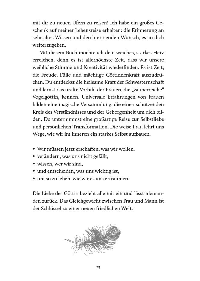 Einleitung Die Zeit des großen Wandels und die Rückkehr der weiblichen Kraft wurde von vielen Urvölkern wie den Maya, Hopi und Inka prophezeit. Über viele Jahrtausende wurde die weibliche Kraft in den meisten Teilen der Welt nicht geachtet und gelebt. Die Krisensymptome und das Chaos, das in all unseren Lebensbereichen auftaucht, haben eine gemeinsame Ursache: das Ungleichgewicht zwischen männlichen und weiblichen Kräften. Wir haben uns eine einseitige Art zu leben angewöhnt. Sie ist geprägt von der Dominanz des Verstandes, des Denkens, der Vernunft, des Tuns, Arbeitens, Zieleverfolgens, des Kontrollierens, Optimierens und des Sichanstrengens, während das Ausatmen, das Fühlen, die Intuition, das Fließen mit den eigenen Zyklen und der Rhythmus der Natur, das Genießen, Ausruhen, Spielen, Träumen und Vertrauen abgewertet wurden. Diese unnatürliche Lebensweise hat in Männern und Frauen, in unseren Partnerschaften und Familien, aber auch in Firmen zu großer Unruhe und Hektik geführt. Und dazu, dass wir das Ziel unseres geschäftigen Tuns aus den Augen verloren haben. Frauen haben nun die Hosen an, um unabhängig vom Mann zu sein. Wir haben Erfolg im Beruf und Selbstbewusstsein gewonnen. Doch der Preis, den wir alle für unsere Lebensweise und Freiheit zahlen, ist hoch. Denn wir sind innerlich hart geworden. Wir mussten uns von unseren Gefühlen abtrennen, um zu funktionieren. Inzwischen lehnen viele Frauen ihren Körper und seine Bedürfnisse ab. Sie fühlen sich kraftlos, unklar und desorientiert. Auffallend ist, dass sie häufig erkranken an ihren Brüsten, an der Gebärmutter, den Eierstöcken und Krebs. Aber auch Männern geht es nicht gut. Sie sind verunsichert und wissen nicht, wie sie gesund und glücklich leben und ihre männliche Kraft ausdrücken können. Sie arbeiten pausenlos, halten durch, erfüllen ihre Pflicht, ignorieren ihre Körpersymptome und erfahren körperliche und psychische Krisen, leiden zunehmend an Depressionen, Burn-out, Rückenschmerzen und/oder bekommen einen Herzinfarkt. Männer und Frauen erleben in sich selbst ein großes Ungleichgewicht, und unzählige Krisen fordern uns dazu auf, neue Pfade zu betreten und der weiblichen Kraft in uns selbst und im Leben wieder mehr Raum zu geben. Das bedeutet, dass wir wieder mehr auf unser Gefühl, unser Herz und unseren Bauch hören und nicht nur auf unseren Verstand. Indem wir ruhig werden, uns der Innenwelt zuwenden und bei uns selbst ankommen, schaffen wir wieder ein Gleichgewicht zwischen unserer Innen- und Außenwelt. Wir erkennen, dass unser Verstand uns nicht das geben kann, nach dem wir uns sehnen. Nur unser Herz schenkt uns ein sinnerfülltes, glückliches Leben und eine nährende, liebevolle Gemeinschaft. Frauen verkörpern die weibliche Seite des Lebens. In unserer Zeit kämpfen viele gegen sich selbst. Sie wollen alles anders machen als ihre Mutter, die sich häufig als Opfer fühlte. Außerdem sollten viele Mädchen eigentlich als Jungen geboren werden. So haben wir das Urweibliche verdrängt und unsere Intuition vergessen. Wir haben verlernt, uns selbst zu vertrauen, und vertrauen inzwischen anderen mehr als uns selbst. Wir haben uns kleingemacht und selbst verletzt. Doch jede Frau hat die weibliche Urquelle tief in sich und kann wieder Zugang zu ihr finden. Wir besitzen in jedem Moment die wunderbare Möglichkeit, aus uns selbst heraus neues Leben hervorzubringen. Das kann ein Baby sein. Jede kann aber auch anders kreativ sein und neue Ideen, Lösungen und Visionen ins Leben träumen. Wir können uns selbst neu erfinden und eine stabile Balance in uns entdecken. Diese intuitive, unglaublich kreative Energie verleiht uns Würde und sollte uns mit Stolz erfüllen. Indem wir uns auf unsere weiblichen Qualitäten besinnen und sie in unseren modernen Alltag integrieren, ermöglichen wir es unseren Kindern, Enkeln und nachfolgenden Generationen, auf der Erde zu leben. Frauen repräsentieren die reine, bedingungslose Liebe, die Liebe der Großen Mutter. Die Liebe und Geborgenheit, nach der wir uns alle so sehr sehnen. Aber nur eine Frau, die diesen kostbaren Schatz in sich selbst entdeckt und sich zuallererst mit dieser umfassenden Liebe selbst nährt, ist sie die strahlende, gesunde Frau. In dieser Wandelzeit geht es darum, dass wir uns an die Liebe und unbezähmbare weibliche Kraft in uns erinnern. Aus dieser Kraft heraus können wir gemeinsam die neue Zeit erschaffen. Wir dürfen uns jetzt daran erinnern, dass Frauen nicht schwächer sind als Männer. Die weibliche Energie ist eine andere Kraft. Sie ist unbezähmbar wie die Natur. Sie erlaubt, dass wir jetzt mutig sind und uns unseren Gefühlen, Sehnsüchten, alten Mustern und unserer Angst stellen. Indem wir uns Zeit nehmen für uns selbst, für Besinnung, den Weg nach innen, Meditation, Yoga, und auf das lauschen, was unser Herz uns zuflüstert. Wir nähren unsere Seele mit Musik, Farben, Tanz, berührender Literatur, Spaziergängen in der Natur und dem Erfahrungsaustausch mit unseren Schwestern. Zeit allein ist eine kostbare Kraftquelle. Du gönnst dir Massagen, Sauna, Badewanne, und allmählich wird dein Körper zu deiner besten Freundin. So kommst du in Kontakt mit deiner inneren Frau und öffnest dich mehr und mehr für die Signale deines Herzens und deiner Sinne. Auf diesem Weg fühlen wir, was uns kleingehalten hat. Damit befreien wir diese Energie und verwandeln sie in reine Schöpferinnenkraft. Wir gestalten unseren Tag bewusst und konzentrieren uns auf uns selbst. So übernehmen wir die Verantwortung für die Erschaffung und Gestaltung unseres Lebens. Dabei helfen uns großartige Vorbilder von Frauen, die schon unseren Ahninnen die tiefen Wahrheiten des weiblichen Seins nahegebracht haben. Weibliche Göttinnen bringen uralte Botschaften an die Oberfläche unseres Bewusstseins, die jetzt gehört und beachtet werden wollen. Sie erinnern uns an unsere weibliche Macht. All diese Gedanken und Erfahrungen bewegen mich, und schließlich setz