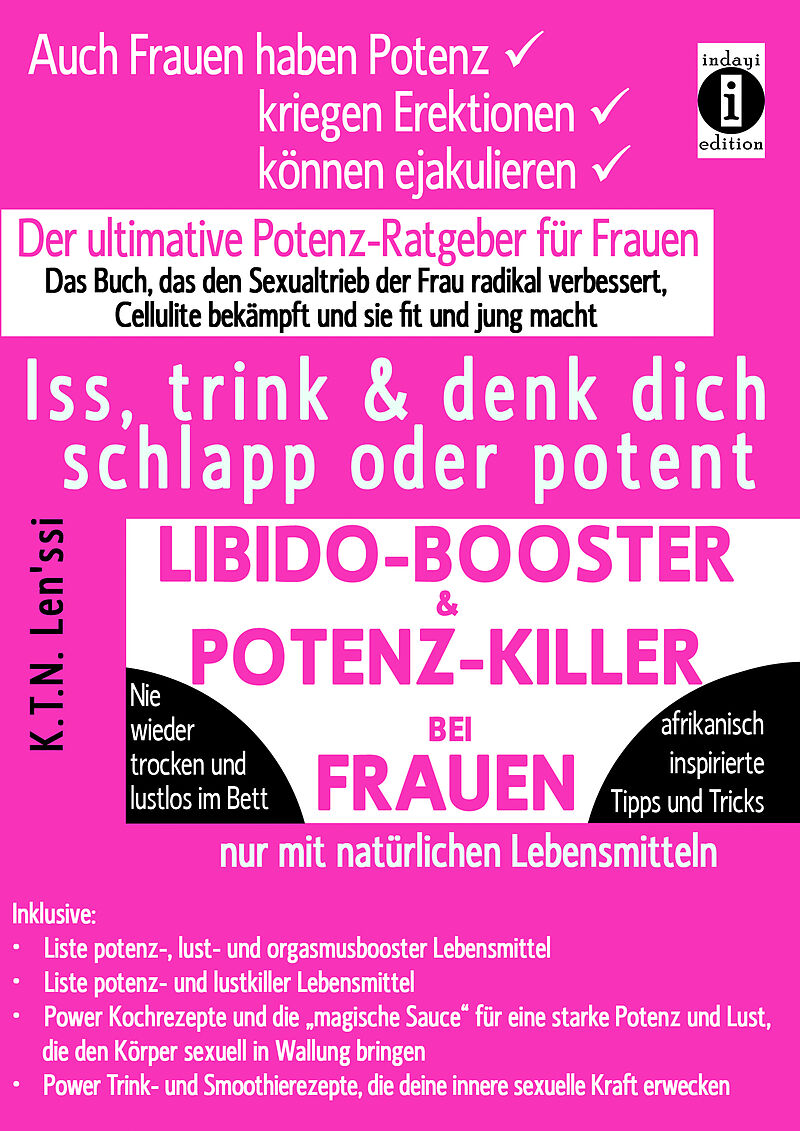 Das ultimative Libido- und Potenz-Buch für Frauen: Dieses Buch verändert und bereichert die Libido und die Sexualität von Frauen mit über 500 Seiten geballtem Wissen, afrikanischen Tipps und Tricks und Erfahrungen. Dass auch Frauen Potenz haben, Erektionen ken...Das ultimative Libido- und Potenz-Buch für Frauen: Dieses Buch verändert und bereichert die Libido und die Sexualität von Frauen mit über 500 Seiten geballtem Wissen, afrikanischen Tipps und Tricks und Erfahrungen. Dass auch Frauen Potenz haben, Erektionen kennen und ejakulieren können, das bedeutet auch unter Potenzschwäche und Erektionsstörungen leiden können, wird tabuisiert. Der Autor und Coach K.T.N. Len'ssi zeigt in diesem Ratgeber erstmalig und deutlich, wie die Ernährung, die einfache Ernährung, den größten Einfluss auf die Libido der Frau hat. Er erklärt, wie das, was Frauen essen, ihre Potenz, ihre Erektion und ihr Lustempfinden schwächen, stören oder extrem steigern kann. Im ersten Teil dieses Buches erfährt man detailliert, warum die Potenz gestorben ist oder was sie belastet. Warum wirst du nicht feucht? Warum kommst du nicht zum Orgasmus? Warum ist deine Libido weg? Im zweiten Teil wird gezeigt, wie man die Potenz boostet und die Lust anfacht. Das ganze Buch wird abgerundet mit leckeren, potenzsteigernden Koch-, Trink- und Smoothie-Rezepten, die den Körper der Frau sexuell in Wallung bringen.