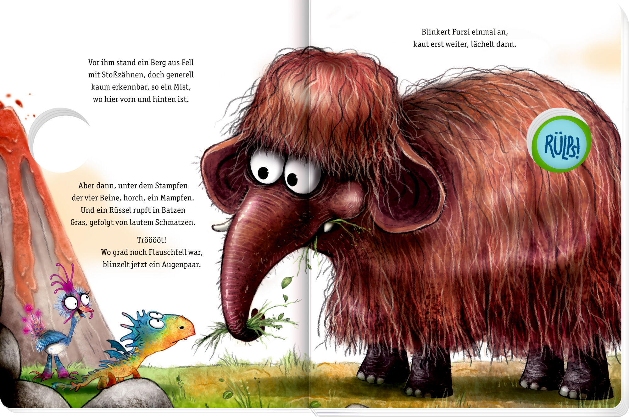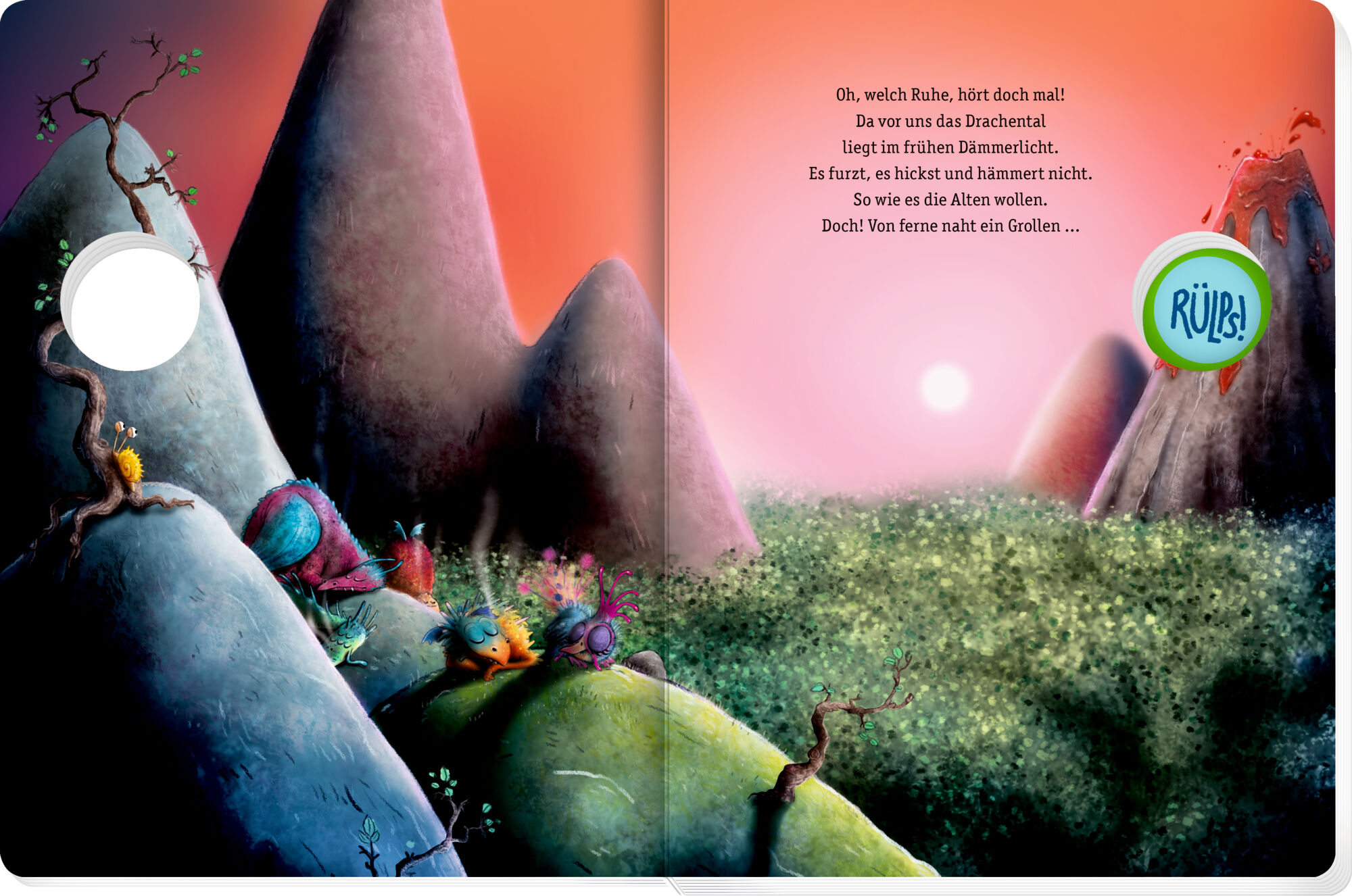 Oh, welch Ruhe, hört doch mal! Da vor uns das Drachental liegt im frühen Dämmerlicht. Es furzt, es hickst und hämmert nicht. So wie es die Alten wollen. Doch! Von Ferne naht ein Grollen Und BÖÖÖÖRPS!!! zerreißt ein Rülpser die Stille. Hinter dem Vulkan steht ...