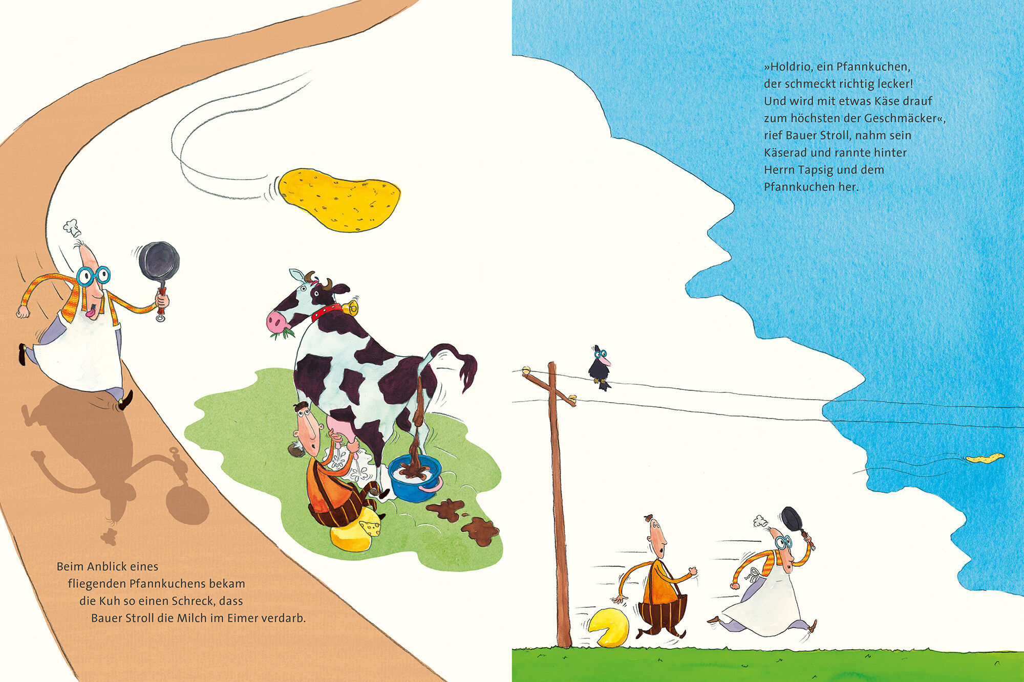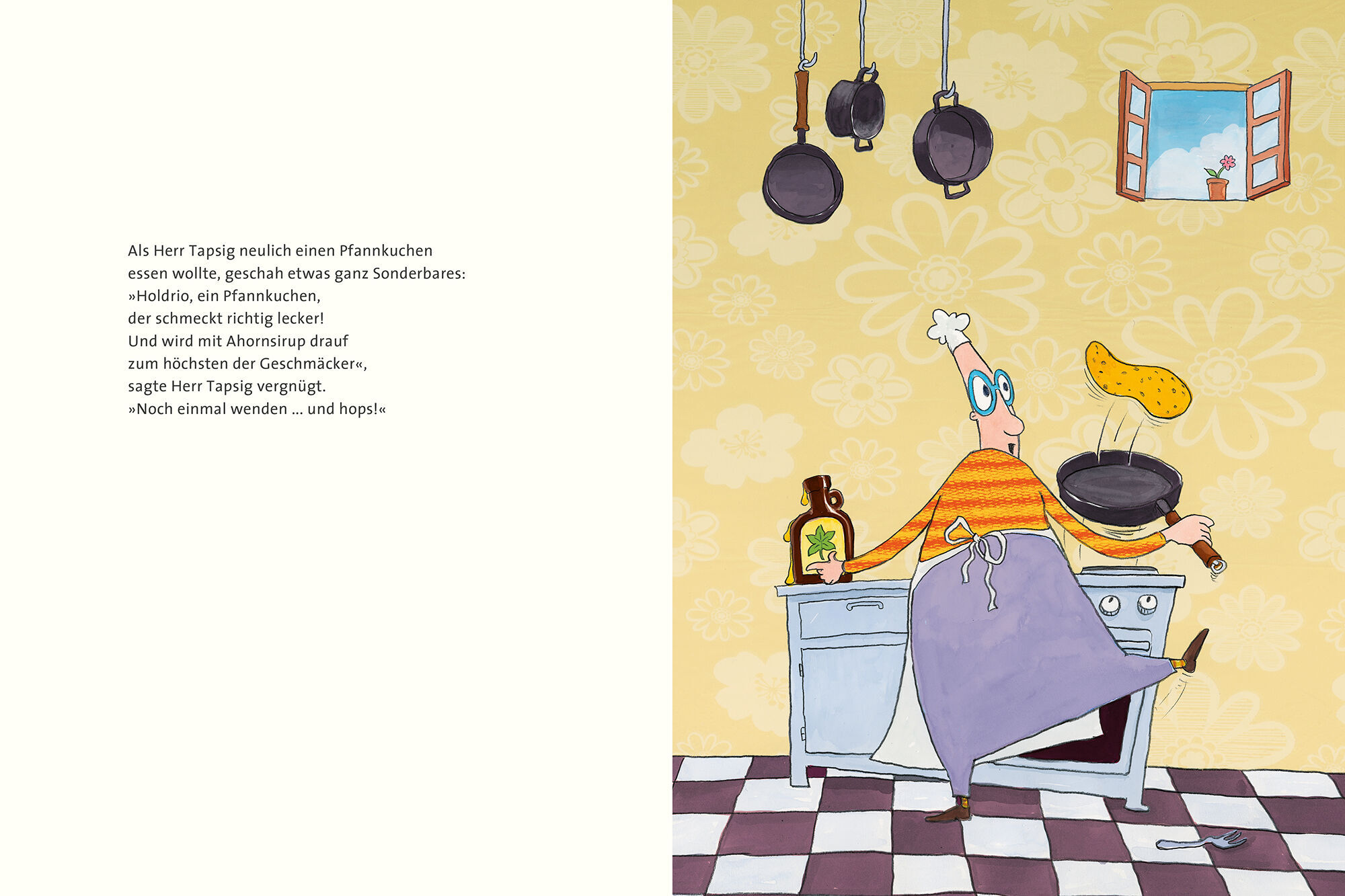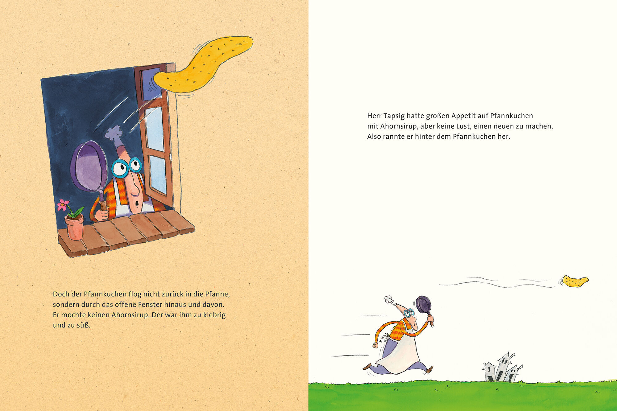 Nichts wie weg! Der Pfannkuchen von Herrn Tapsig hat seinen eigenen Kopf. Und mit klebrigem, süßem Ahornsirup will er auf keinen Fall bestrichen werden. Schnell flieht er durch das offene Küchenfenster. Doch Herr Tapsig heftet sich an seine Fersen. Dieser Leck...