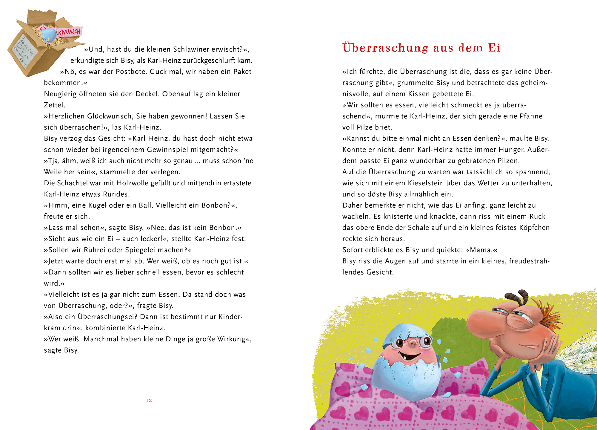 "Ding-dong! Als der Paketbote bei Karl-Heinz und Bisy klingelt stehen die Kreuzspinne und die Stubenfliege vor einem Rätsel. Denn das Paket enthält ein rundes Irgendwas. Ein Ei! Ob sie wollen oder nicht: Der Familienzuwachs steht an. Und die Adoptivtochter bri...