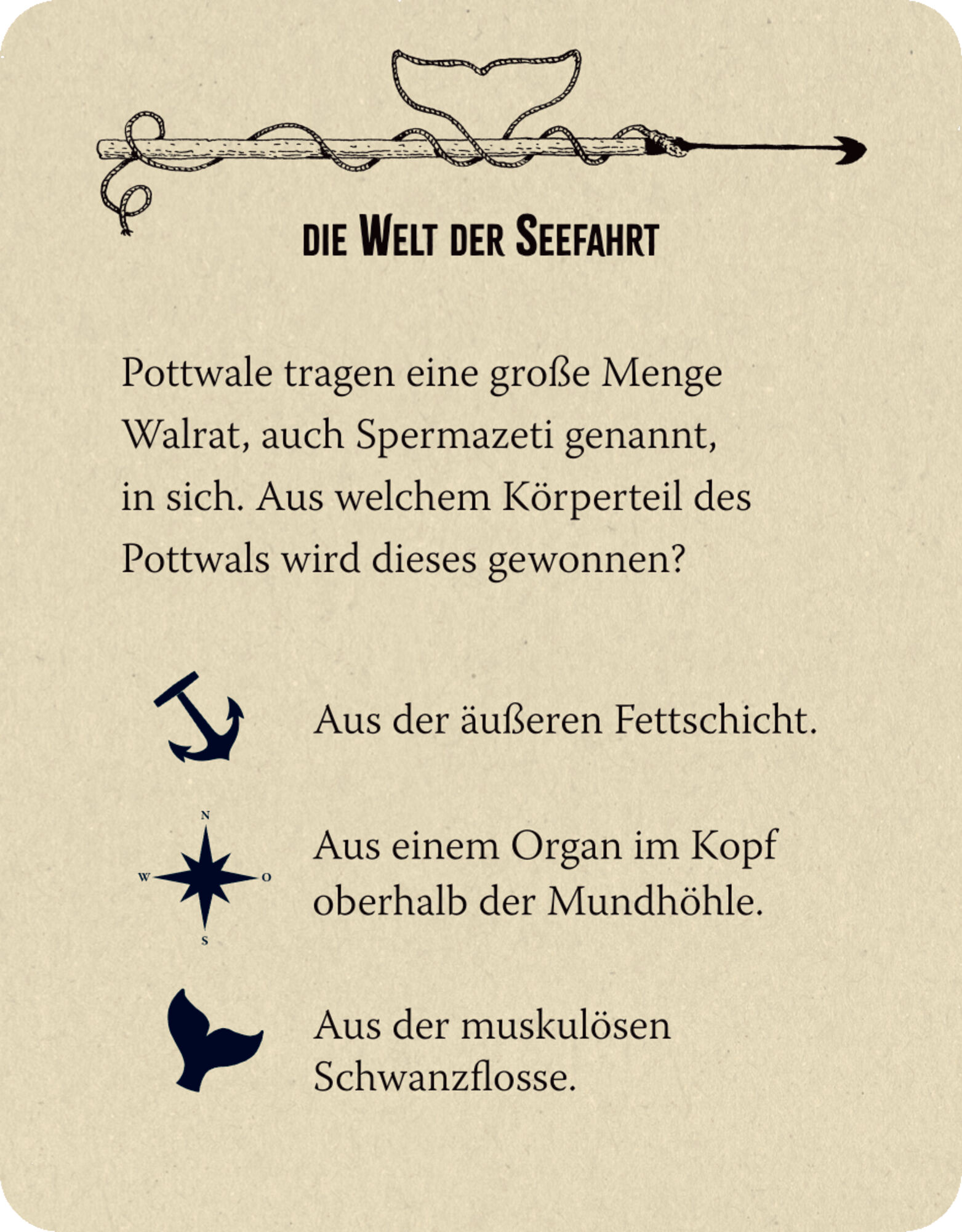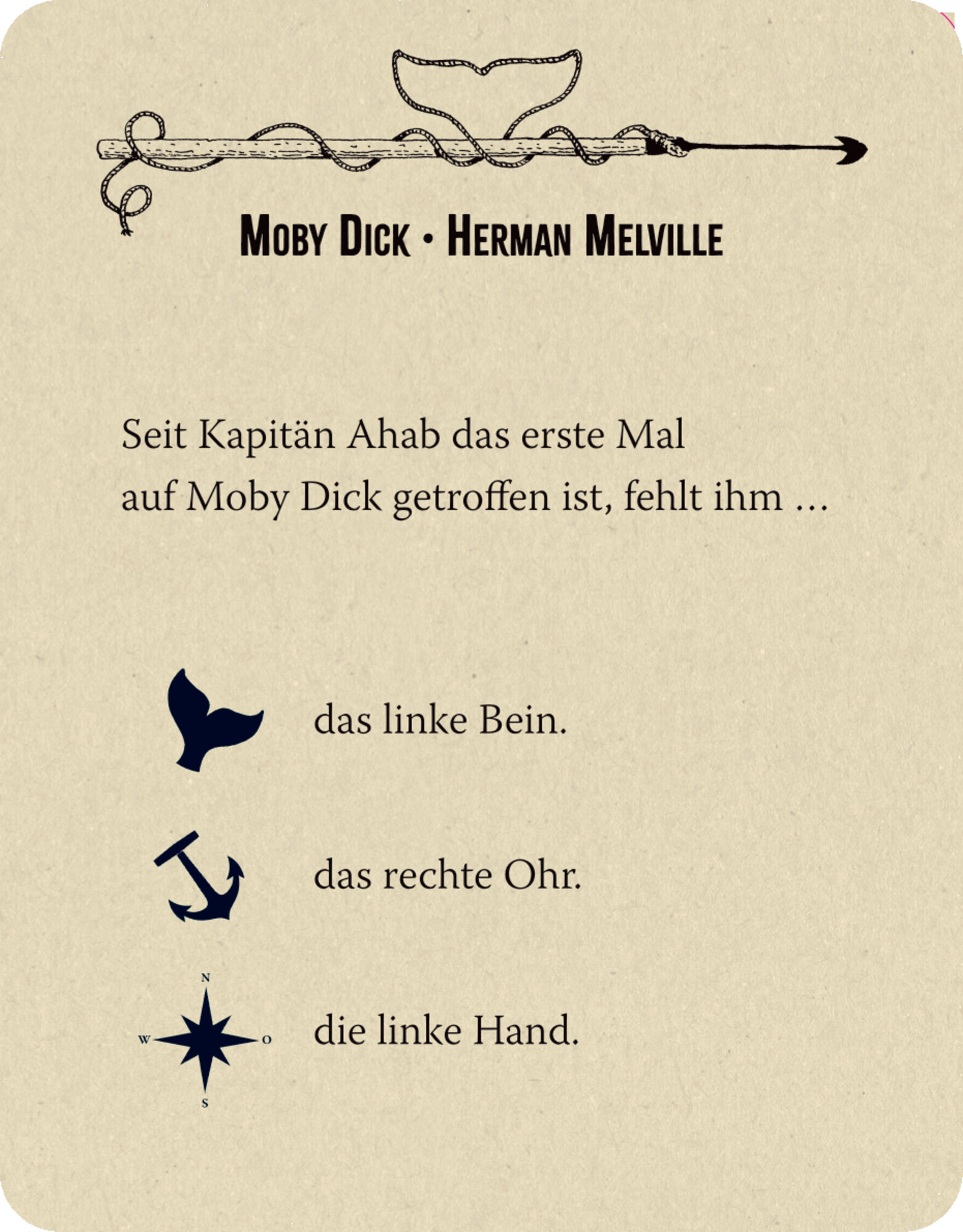 Teste dein Wissen um den großen Klassiker! Welcher Walart gehört Moby Dick an? Was gehört zur Standardausrüstung beim Walfang im 19. Jahrhundert? Und wie nennt man die Schwanzflosse eines Wals? Informativ und unterhaltsam entführt dieses Quiz mit 40 Fragen un...